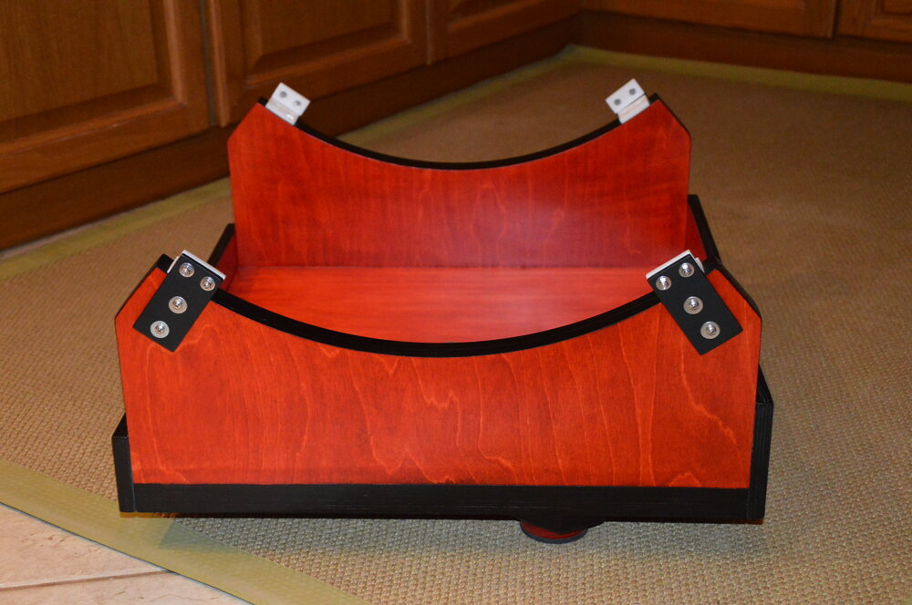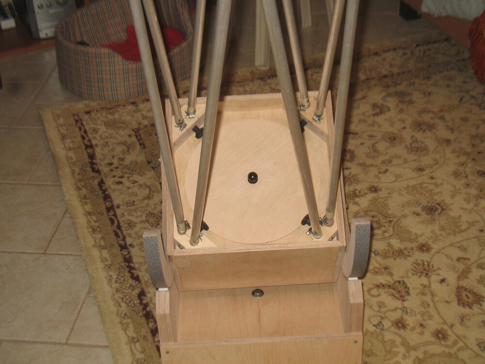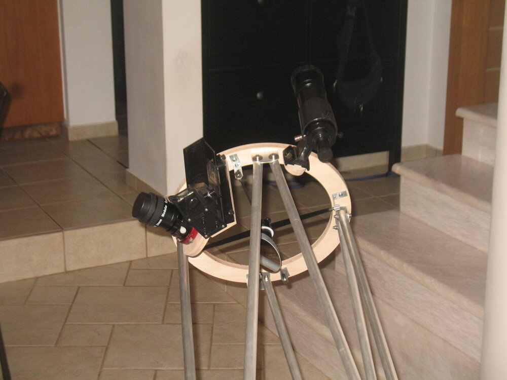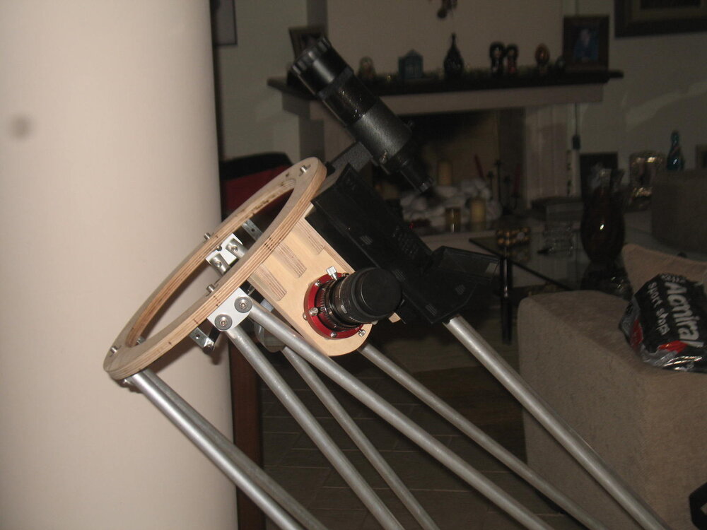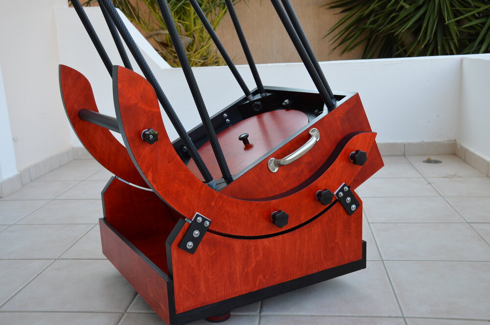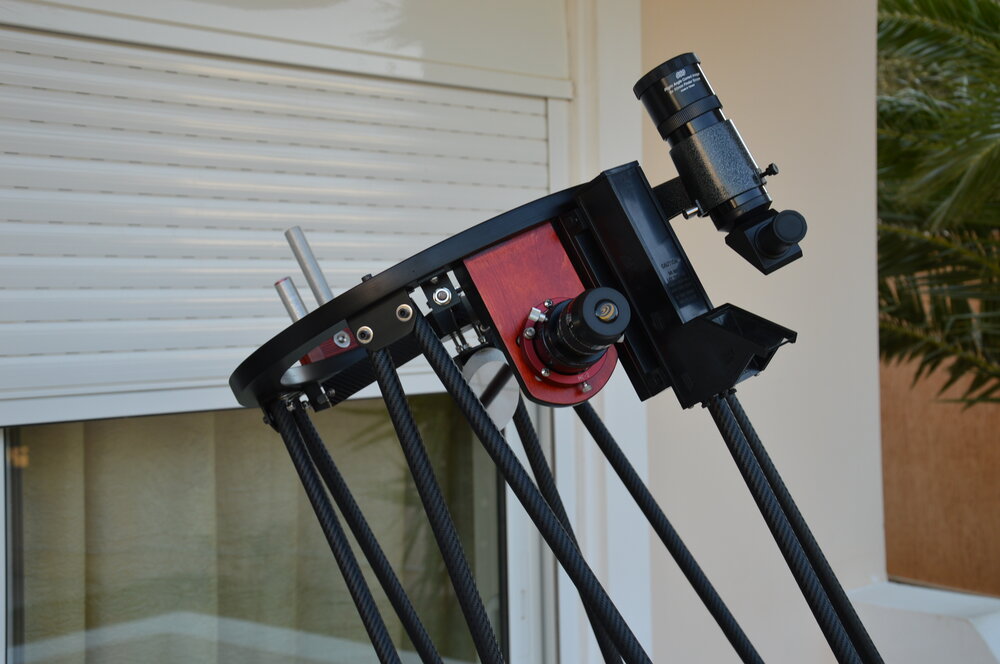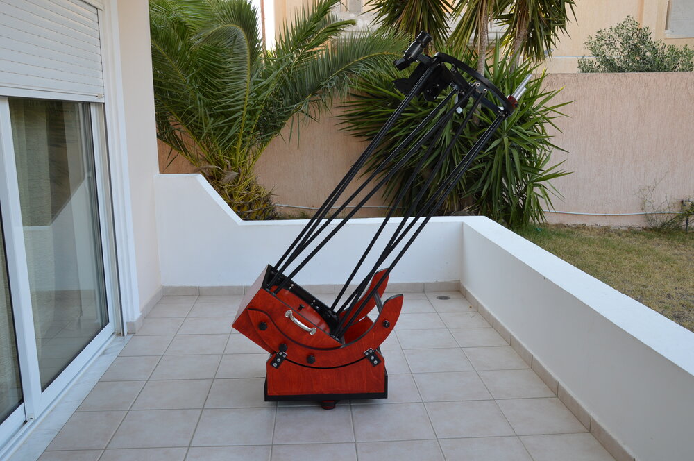 Καλησπέρα σε όλους. Μόλις ολοκλήρωσα με την κατασκευή του τηλεσκοπίου μου και ακολουθούν φωτογραφίες της τελικής του μορφής. Μου απέμεινε μόνο το ράψιμο ενός φωτοχιτωνίου. Τα ξύλινα μέρη του τηλεσκοπίου πρώτα βάφτηκαν με ανιλίνη οινοπνεύματος με απόχρωση μαόνι και στη συνέχεια εφαρμόστηκαν λούστρα νερού ή λούστρα πολυουρεθάνης (άνω κλωβός). Οι εσωτερικές επιφάνειες του άνω κλωβού και του mirror box βάφτηκαν με βερνικόχρωμα μαύρο ματ, όπως και οι γωνίες συνδεσης των αντιστηριγμάτων με τον άνω κλωβό καθώς και οι γωνίες στήριξης της αράχνης. Για να μειώσω όσο μπορούσα τις αντανακλάσεις αποφάσισα να ντύσω τα αντιστηρίγματα με μαύρο αυτοκόλλητο πλαστικό απομίμηση ανθρακονήματος.