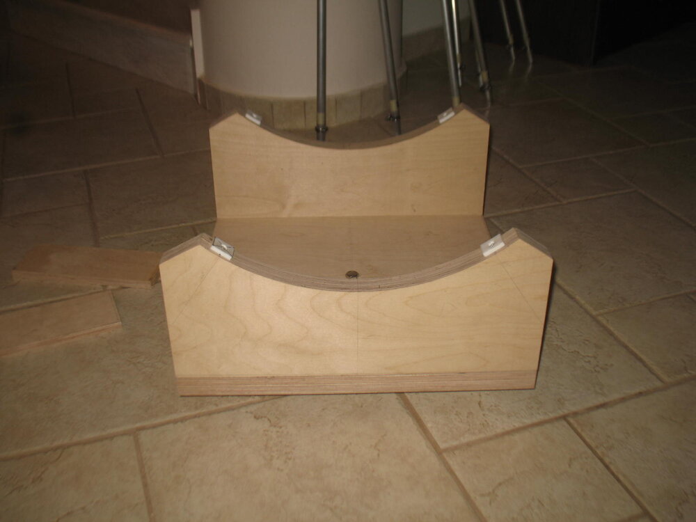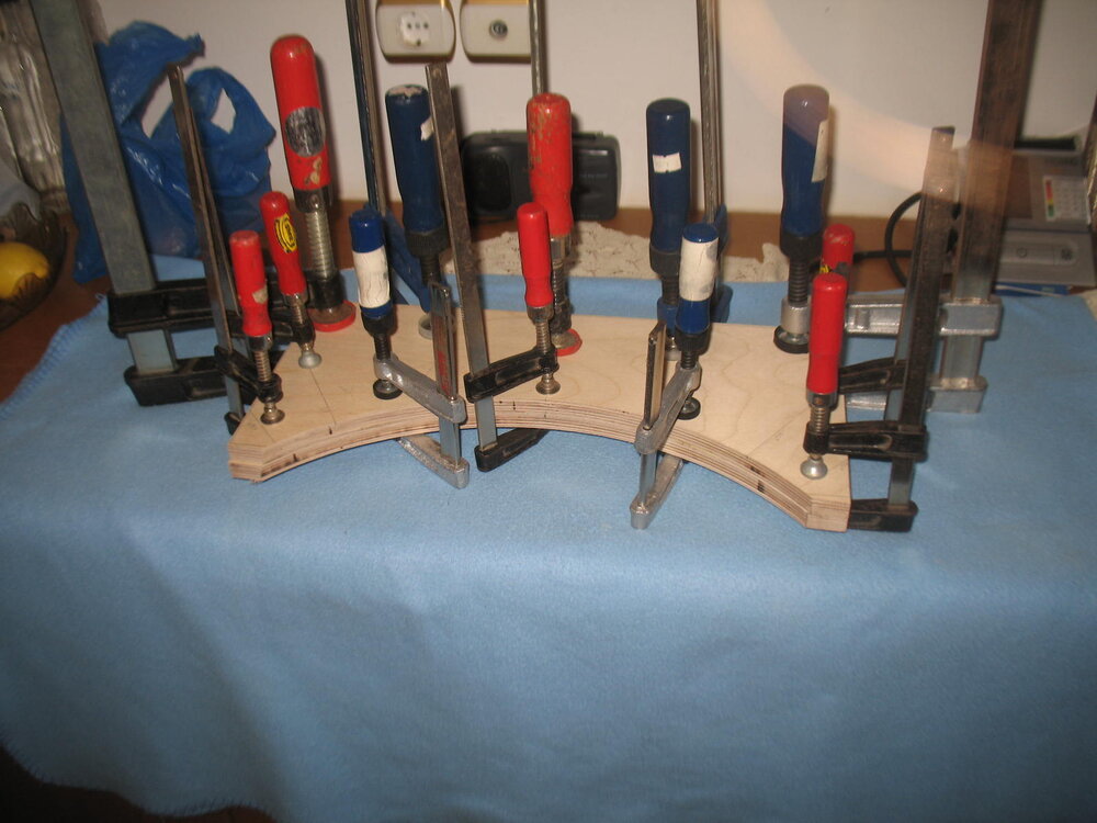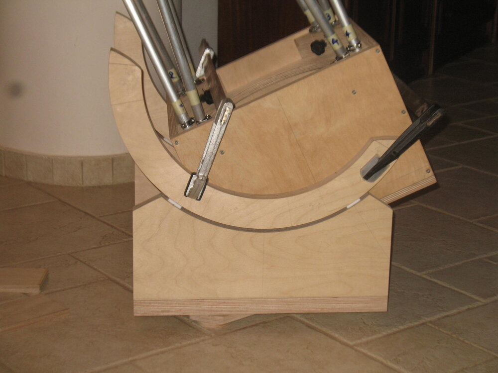 Γειά σας και πάλι. Μετά από αρκετό καιρό, είμαι στην ευχαριστή θέση να σας παρουσιάσω την νέα πρόοδο στην κατασκευή μου. Για πρακτικούς (χώρος και για δεύτερο οπτικό ερευνητή) και κυριώς αισθητικούς λόγους (μου κακοφαίνονταν οι βίδες) αποφάσισα να επανακατασκευάσω τον άνω κλωβό.Έχω ολοκληρώσει πλέον με το κατασκευαστικό κομμάτι του τηλεσκοπίου και μπαίνω στην τελική ευθεία που περιλαμβάνει τριψίματα, βαψίματα και λούστρα. ALTITUDE BEARINGS, ROCKER BOX ΚΑΙ GROUND BOARD Τα altitude bearings κατασκευάστηκαν από διπλό κοντρα πλακέ (συνολικό πάχος περίπου 30 mm), έχουν πλάτος 2 ίντσες και είναι κυκλικά τόξα 165 μοιρών. Για να γλιτώσω χρόνο, κόπο και ξύλο, κόπηκαν ταυτόχρονα με τις θηλυκές καμπύλες-τα πλαϊνά του rocker box, με router και φρέζα 5mm, όσο είναι δηλαδή το πάχος των teflon που χρησιμοποίησα (ακολουθεί σχετική φωτο). Τα bearings είναι αποσπώμενα και βιδώνονται στο mirror box μέσω τριών εξάγωνων βιδών Μ10 το καθένα. Στο εσωτερικό των πλαϊνών του mirror box υπάρχουν αντίστοιχα τρία καρφωτά περικόχλια Μ10. Βάσει των υπολογισμών που έκανα για τις ροπές και το κέντρο βάρους του τηλεσκοπίου, η διάμετρος των bearings μου βγήκε στα 52 cm ( ελαφρώς οπισθοβαρές). Το rocker box έχει εσωτερικές διαστάσεις 44 cm X 44 cm περίπου, κατά 2mm πιο πλατύ από το πλάτος του mirror box συν το πλάτος των bearings. Ο πάτος και τα πλαϊνά του είναι επίσης από διπλό κόντρα πλακέ για να είναι άκαμπτο και στιβαρό. Τα τεφλόν στις θηλυκές καμπύλες των πλαϊνών απέχουν μεταξύ τους 70 μοίρες. Υπολογίζοντας θεωρητικά το βάρος του τηλεσκοπίου μαζί με τα bearings αλλά και του rocker box, τα τεφλόν για την καθ'υψος κίνηση αλλά και για την κίνηση στο αζιμούθιο κόπηκαν στις κατάλληλες διαστάσεις ώστε η πίεση που εξασκείται στο καθένα να είναι περίπου στα 16,5 psi. Για την κίνηση στο αζιμούθιο, προς το παρόν, έχω βάλει 3 και όχι 4 τεφλόν, καθώς το τηλεσκόπιο ζυγίζει λιγότερο από 70 pounds. Μελλοντικά θα πειραματιστώ με τις διαστάσεις των τεφλόν. Πιο συγκεκριμένα έχω υπολογίσει θεωρητικά τα ακόλουθα βάρη : Τηλεσκόπιο και bearings : 17 Kgs περίπου Rocker box και Ground board : 4,5-5 Kgs To ground board είναι τριγωνικό και έχει τρία ποδαράκια κυκλικής διατομής 64mm για να ακουμπάει στο έδαφος. Τα τεφλόν για την κίνηση στο αζιμούθιο έχουν τοποθετηθεί σε απόσταση 19 cm από την τρύπα της pivot bolt. Για την περιστροφή του rocker box κατά το αζιμούθιο υιοθέτησα την συνδεσμολογία που προτείνεται στο site της astrosystems, με την διαφορά ότι δεν έχω χρησιμοποιήσει το τέταρτο τεφλόν : http://www.astrosystems.biz/pivot.htm Όσον αφορά την φορμάικα των bearings και στον πάτο του rocker box, ένας φίλος από αμερική μου βρήκε και μου έστειλε την Stardust της Formica. Για την κόλληση της στις επιφάνειες του ξύλου χρησιμοποίησα βενζινόκολλα. Οι πρώτες εντυπώσεις μου από την συμπεριφορά του τηλεσκοπίου ? Έχω πάθει πλάκα, καμμία σχεση με το κινέζο πρόγονό του. Η κίνησή του στρωτή και στιβαρή χωρίς αναπηδήσεις. Και οι υπολογισμοί μου πρέπει προσεγγίζουν σε μεγάλο βαθμό την πραγματικότητα. Με το βαρύτερο προσοφθάλμιο μου και τους 2 ερευνητές πάνω, το τηλεσκόπιο ισορροπεί απόλυτα σε κάθε γωνία στόχευσης. Θεωρώ ότι τελικά άξιζε τον κόπο το εγχείρημα. Τηλεσκόπιο 3 Τηλεσκόπιο 2 Τηλεσκόπιο 1 Η θέση που τοποθέτησα τελικά τον οπτικό ερευνητή Ο νέος και τελικός άνω κλωβός Το καπάκι του mirror box Η άλλη μεριά του ground board Τα τεφλόν στο ground board Η φορμάικα στον πάτο του rocker box To rocker box τελειωμένο Δοκμές για την σωστή τοποθέτηση των bearings στο mirror box Το rocker box ημιτελές Κόλληση των διπλών πλαϊνών του rocker box Η τελική μ