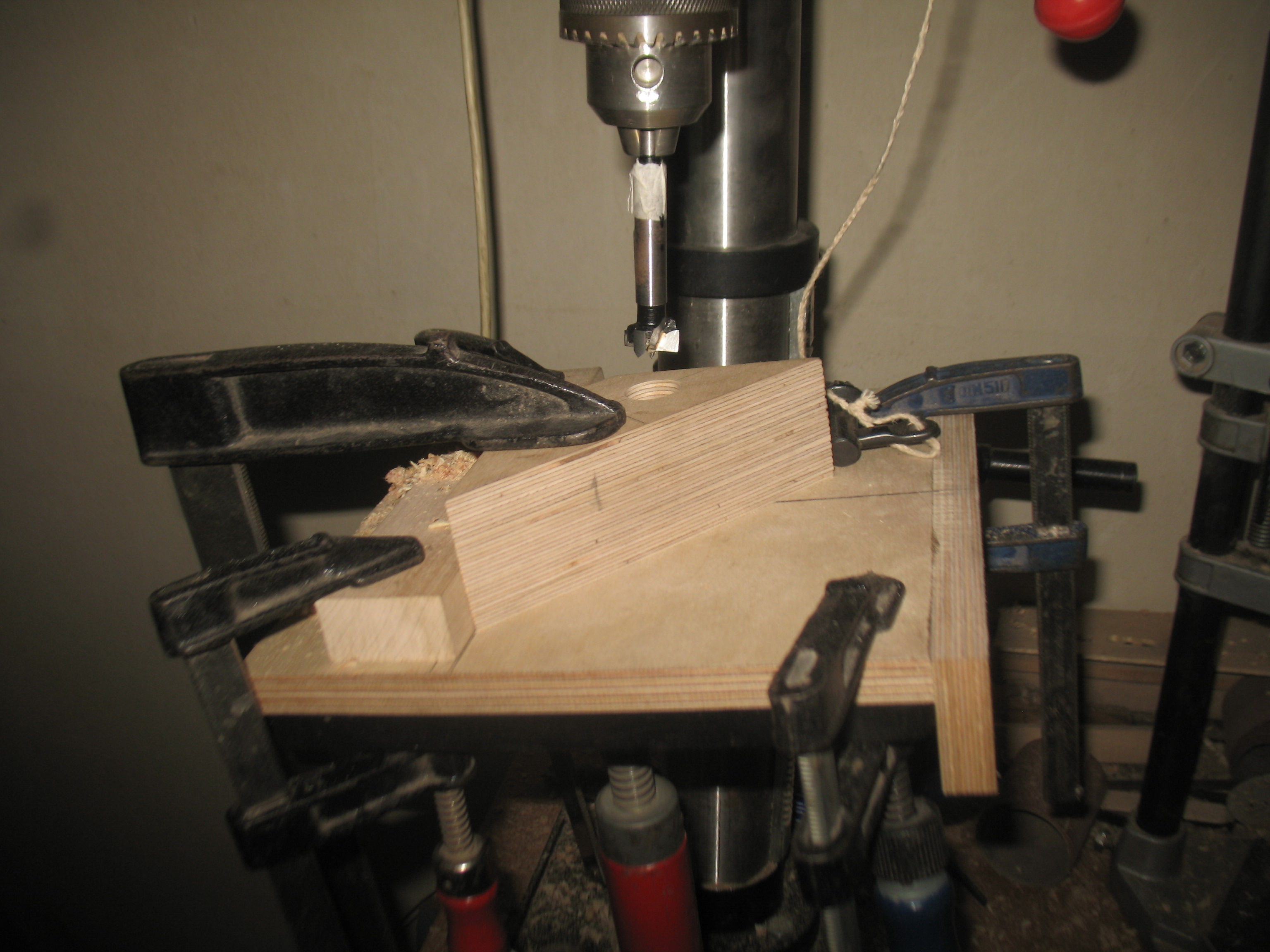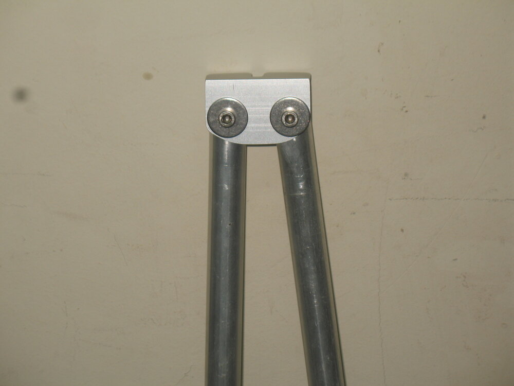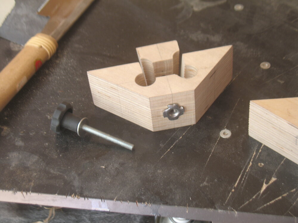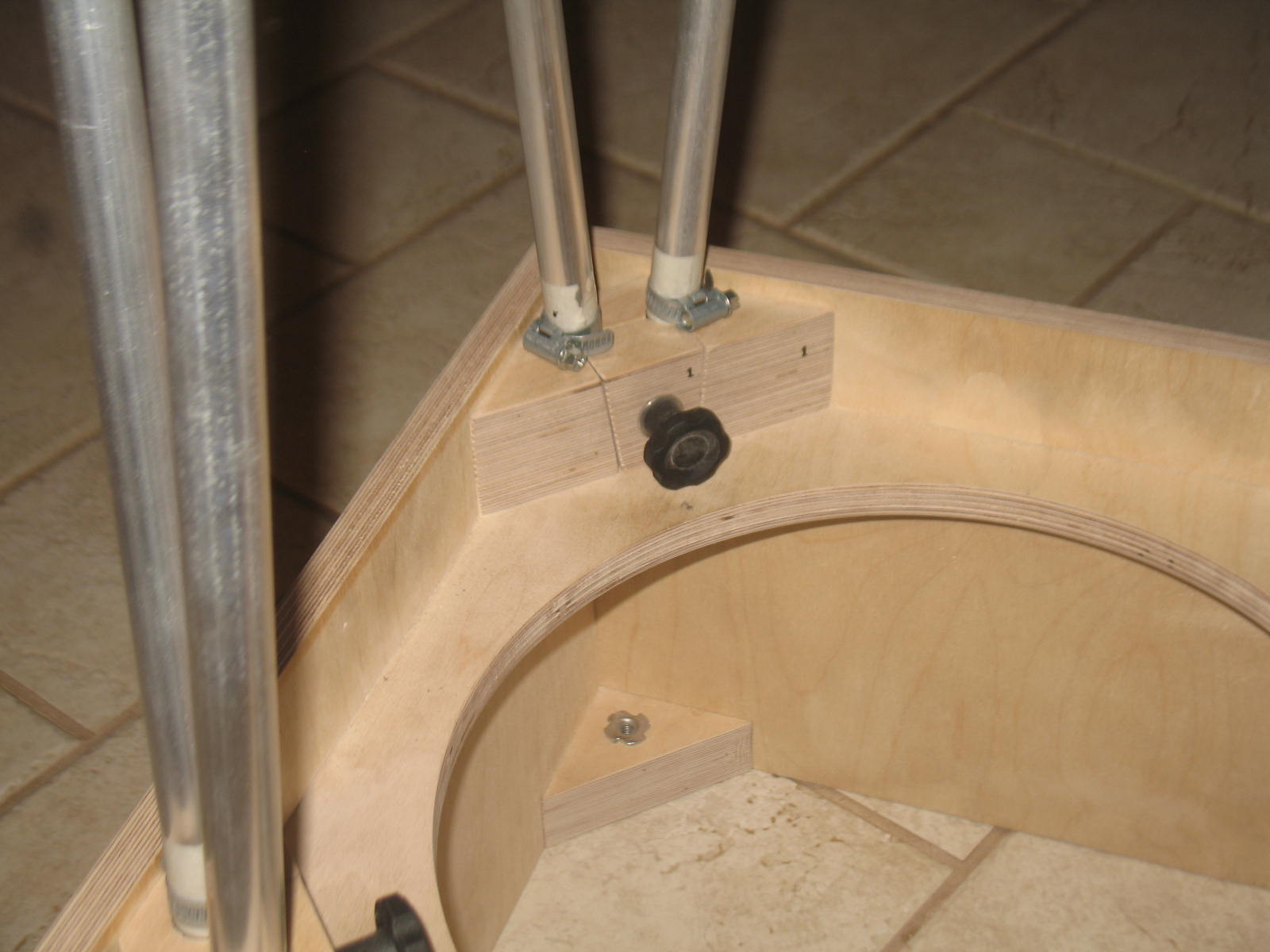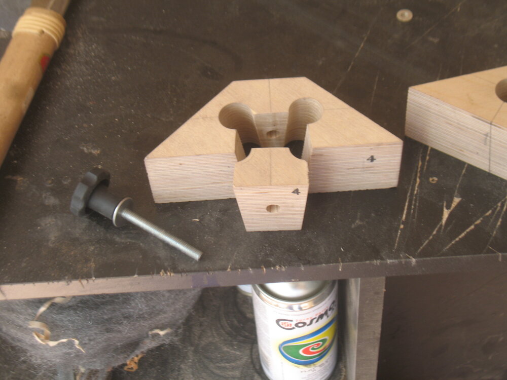 ΣΥΝΔΕΣΕΙΣ ΣΤΟ MIRROR BOX Για την σύνδεση των αντιστηριγμάτων με το mirror box, υιοθέτησα την τεχνική που εφάρμοσε και ο φίλος ο Δημήτρης ο Μανούσος στις δικές του κατασκευές. Οι σφιγκτήρες αυτού του τύπου έχουν γενικά το πλεονέκτημα ότι λειτουργούν ταυτόχρονα ως νεύρα, καθώς τοποθετούνται στις γωνίες του mirror box, αυξάνοντας την ανθεκτικότητά του, και επίσης αποτρέπουν την στρέβλωση των πλευρών του κουτιού, που προκαλείται με τα άλλα είδη συνδέσεων που βασίζονται στην στήριξη των ανιστηριγμάτων ανά δύο στην εσωτερική ή εξωτερική επιφάνεια των πλευρών. Το άνοιγμα των τρυπών ύπο κλίση 83 μοιρών έγινε με την βοήθεια τρυπανιού forstner 18 mm σε βάση μεταβλητής κλίσης. Μετά το τρύπημα, κόπηκε ένα μέρος της κάθε σύνδεσης ώστε να αποτελέσει το κινητό μέρος του σφιγκτήρα για την συγκράτηση των σωλήνων. Στη μικρή πλευρά του τραπεζίου του κάθε σφιγκτήρα τοποθετήθηκε καρφωτό περικόχλιο Μ6 και η σύσφιξη επιτυγχάνεται μέσω μιας χειρόβιδας με ντίζα Μ6 Προσχέδιο σφιγκτήρα σύνδεσης στο mirror box