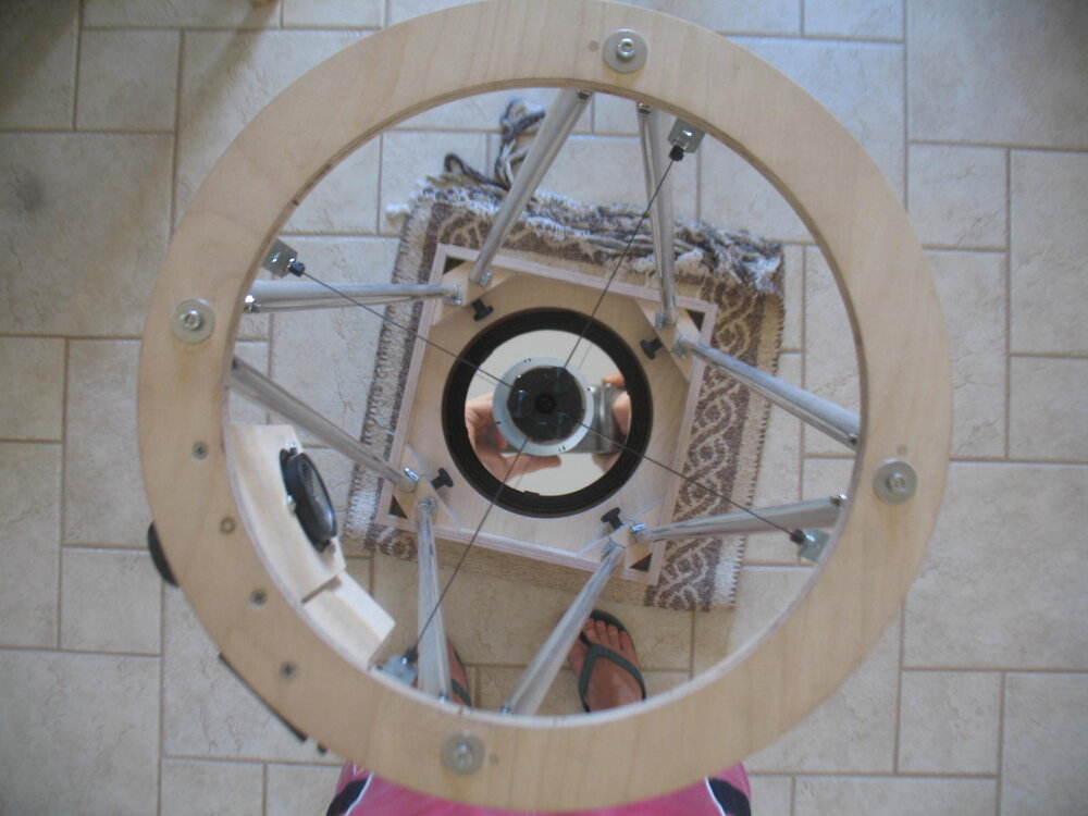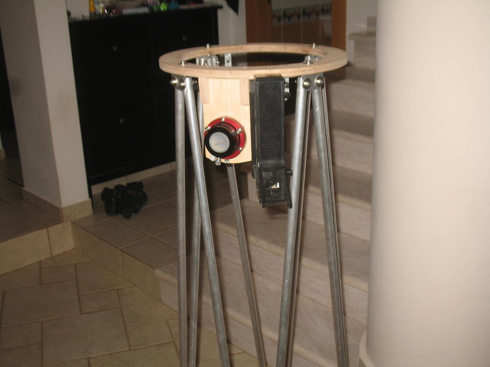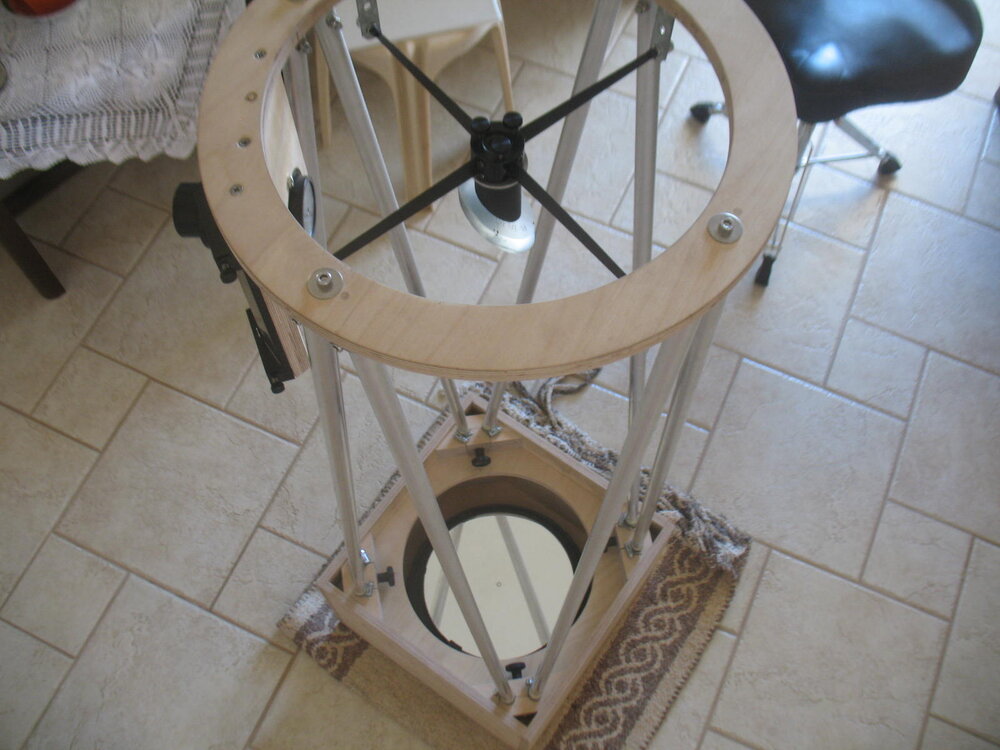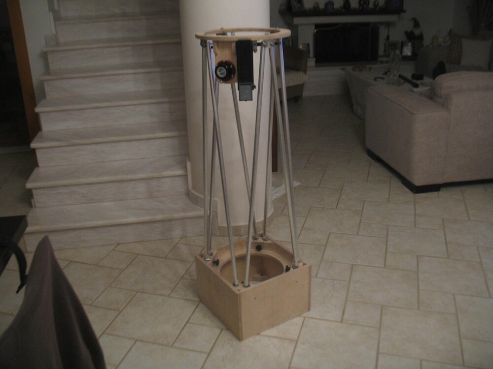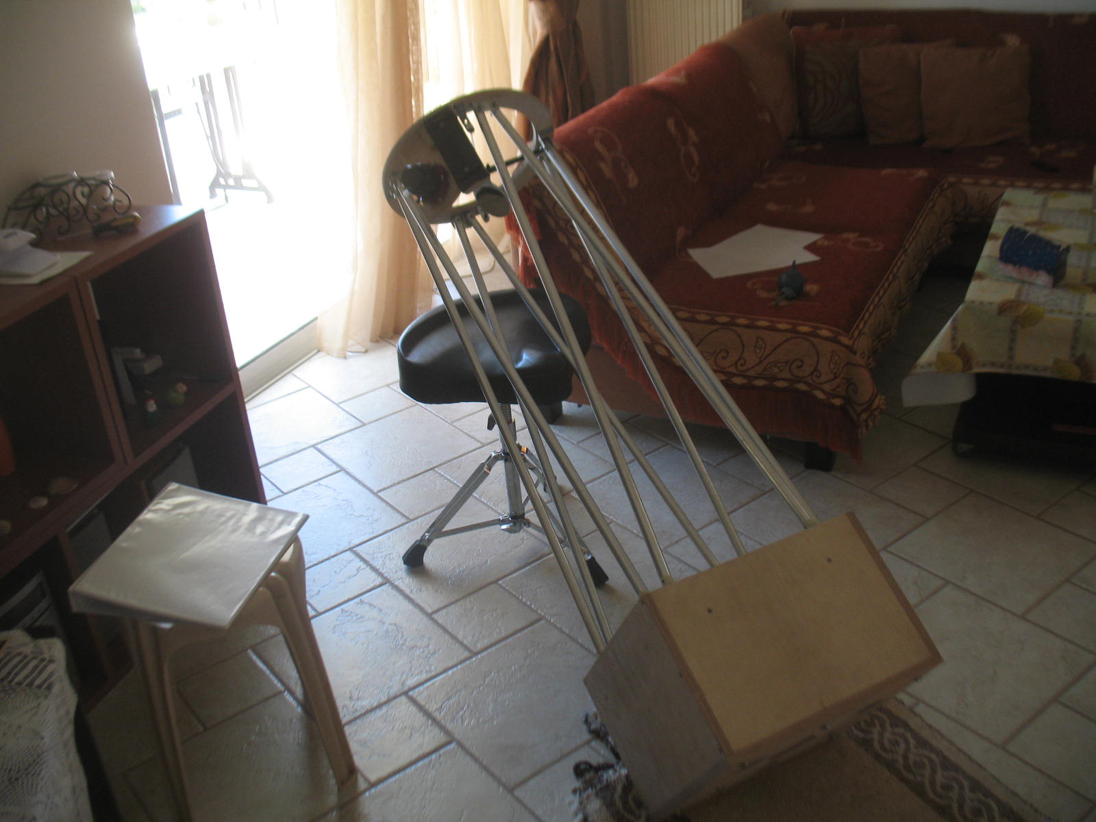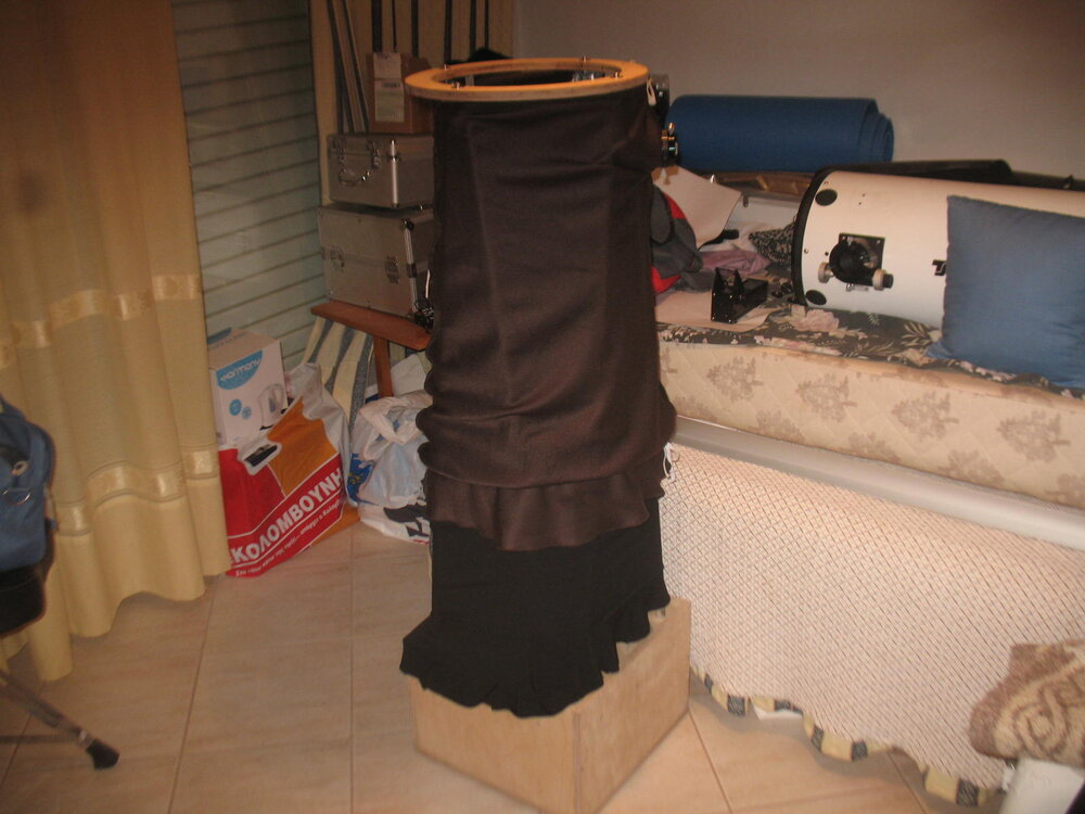 Οι δοκιμές εστίασης μου έδειξαν ότι οι σωλήνες ήθελαν λίγο κόψιμο σε σχέση με τα 103 cm που είχα υπολογίσει θεωρητικά. Το τελικό μήκος μου βγήκε στα 101,5 cm που σημαίνει ότι ο ρεαλιστικός εστιακός λόγος του τηλεσκοπίου είναι περίπου F4.95 και όχι F5. Επειδή μελλοντικά, όπως προανέφερα θα αλλάξω τον αντάπτορα των 1,25'' στον εστιαστή, στη βάση των αντιστηριγμάτων έβαλα σφιγκτήρες-κολλάρα για να μπορώ να μεταβάλλω το μήκος των σωλήνων και επομένως το εστιακό σημείο του τηλεσκοπίου. Έτοιμο για δοκιμές εστίασης...με πρόχειρο φωτοχιτώνιο από φορέματα lycra...χαχαχαχα Άποψη από το πλάϊ Με το κάτοπτρο πάνω Εστιαστής και telrad στον άνω κλωβό. Δυστυχώς δεν υπάρχει χώρος για γωνιακό ερευνητή... Πρώτο πρόχειρο στήσιμο Σφιγκτήρες-κολλάρα για τον έλεγχο του ύψους του εστιακού σημείου Αντιστηρίγματα στο τελικό τους μήκος