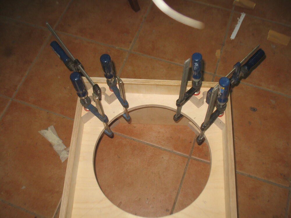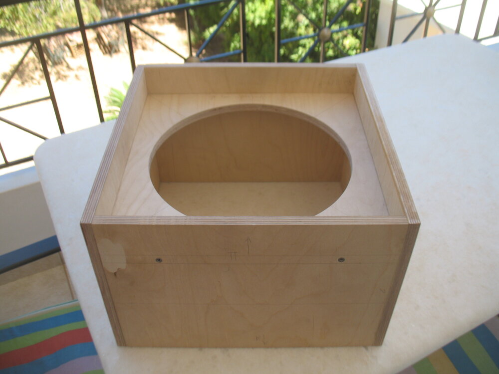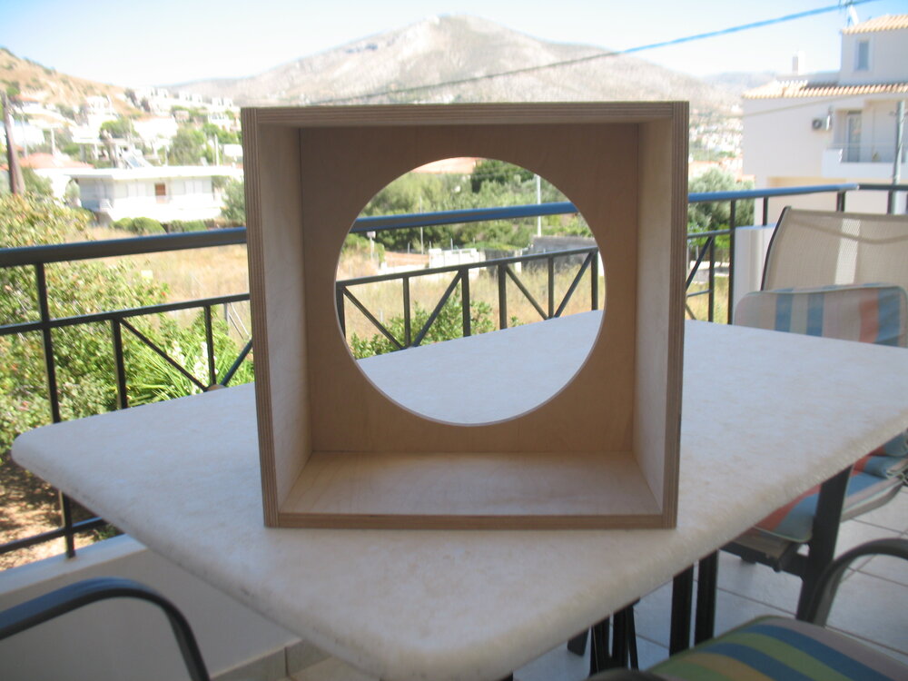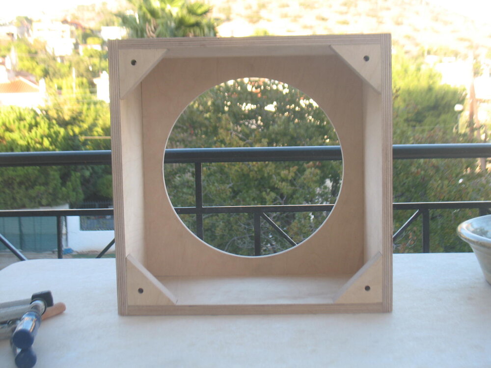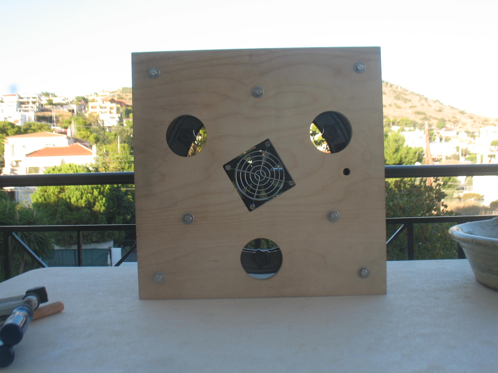 MIRROR BOX To mirror box είναι τετράγωνο με εσωτερικές διαστάσεις 35,5 Χ 35,5 Χ 25 cm. Κατέληξα στις συγκεκριμένες διαστάσεις μετά από πολλές δοκιμές και υπολογισμούς κατά τον σχεδιασμό του τηλεσκοπίου στο χαρτί, έτσι ώστε βάρος του μαζί με το κάτοπτρο και το κελί του να είναι ικανό να διατηρήσει το κέντρο βάρους του τηλεσκοπίου χαμηλά και κατ'επέκταση η διάμετρος των καμπυλών, για την κίνηση του καθ'ύψος να μην μου βγεί υπερβολικά μεγάλη, όταν φτάσω στο σημείο της κατασκευής του rocker box. Στον πυθμένα του mirror box θα μπεί αποσπώμενος πάτος, πάνω στον οποίο θα βιδώσω το εργοστασιακό κελί του κατόπτρου, ώστε να έχω την δυνατότητα να το αφαιρώ σε περίπτωση που θέλω να το καθαρίσω. Σε απόσταση 18,5 cm πάνω από τον πυθμένα του mirror box, μπήκε ένα baffle με άνοιγμα κυκλικής διατομής 29 cm, για την προστασία του πρωτεύοντος κατόπτρου από τις αντανακλάσεις και φυσικά από την σκόνη. Για λόγους ασφαλείας και αντοχής, οι πλευρές του κουτιού κολλήθηκαν και βιδώθηκαν μεταξύ τους με μερικές νοβοπανόβιδες.