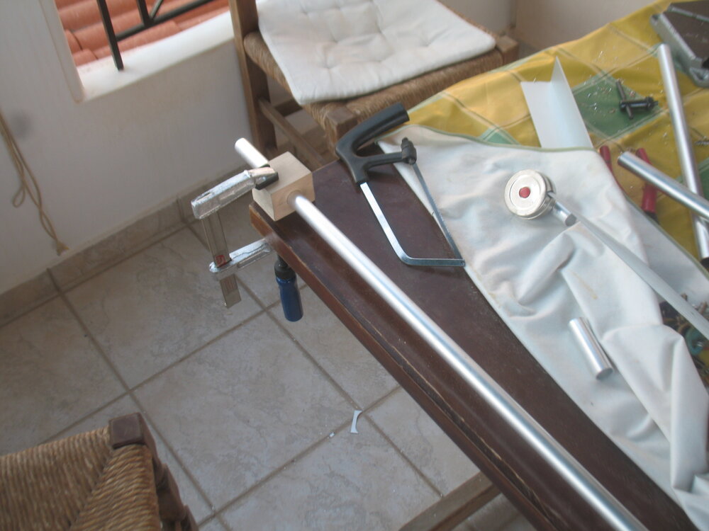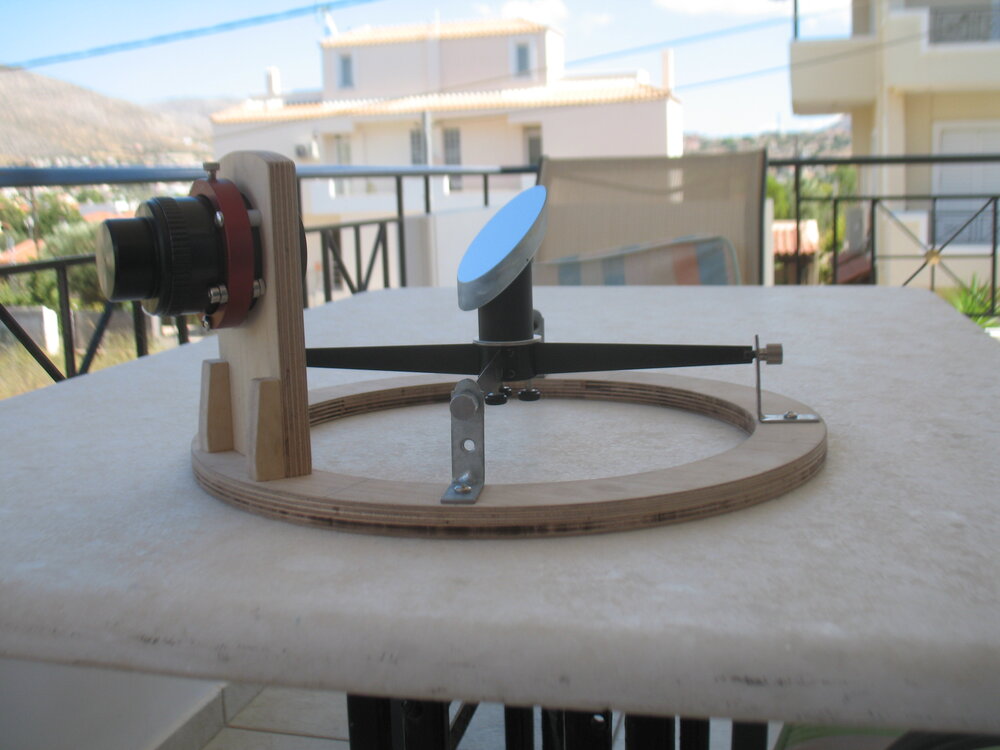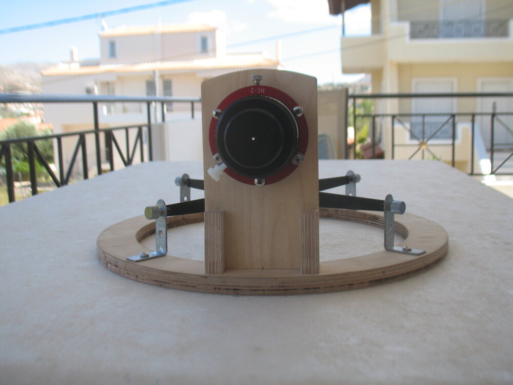 Μετά από αρκετές μέρες απραξίας λόγώ έλλειψης χρόνου, αυτή τη βδομάδα βρήκα λίγο χρόνο για να συνεχίσω την κατασκευή μου. Στο σημείο αυτό θα αναφέρω μία διαπίστωση που έκανα για την ύπαρξη γωνιακού ερευνητή στον άνω κλωβό : η περιορισμένη διάμετρος της στεφάνης, δεν μου επιτρέπει την τοποθέτησή του σε μια βολική ως προς χρήση θέση, οπότε εγκαταλείπω την ιδέα ύπαρξής του στον άνω κλωβό. Τα πράγματα φαντάζομαι είναι ευνοϊκότερα στην περίπτωση κατασκευής ενός τηλεσκοπίου 12 ιντσών και άνω...μεγαλύτερη διάμετρος στεφάνης συνεπάγεται περισσότερος χώρος. Στο mirror box δεν έχω ασχοληθεί ακόμα με τον πάτο του κουτιού, στον οποίο θα βιδώσω το εργοστασιακό κελί με το κάτοπτρο, για τον εξής λόγο : θέλω πρώτα να ολοκληρώσω τα αντιστηρίγματα και τις συνδέσεις τους, να στήσω το υπόλοιπο τηλεσκόπιο , και να κεντράρω με όσο μεγαλύτερη ακρίβεια γίνεται το κελί σε σχέση με το δευτερεύον κάτοπτρο, κοιτάζωντας από τον εστιαστή, ώστε ο ''λουκουμάς'' στο κέντρο του πρωτεύοντος να ευθυγραμμίζεται με το κέντρο του δευτερεύοντος. Με αυτόν τον τρόπο θεωρώ οτι θα περιορίσω στο ελάχιστο, κατά την χρήση του τηλεσκοπίου, τις ρυθμίσεις των δύο κατόπτρων μέσω των βιδών ευθυγράμμισής τους. Στη συνέχεια ανεβάζω κάποιες φωτογραφίες από την κατασκευή των αντιστηριγμάτων και των συνδέσεών τους σε άνω κλωβό και mirror box ΑΝΤΙΣΤΗΡΙΓΜΑΤΑ Όπως προανέφερα τα αντιστηρίγματα είναι σωλήνες αλουμινίου Φ18. Με εφαρμογή του Πυθαγορείου Θεωρήματος (βάσει των αξόνων των αντιστηριγμάτων), στην τελική κατασκευή το μήκος των αντιστηριγμάτων θα πρέπει να είναι στα 103 cm. Παράλληλα, με τον νόμο του ημιτόνου, βρήκα ότι η γωνία που πρέπει να σχηματίζουν τα αντιστηρίγματα με το mirror box πρέπει να είναι 83 περίπου μοίρες. Γενικά διαπίστωσα, οτι οι δύο αυτοί αριθμοί εξαρτώνται από την εστιακή απόσταση του τηλεσκοπίου (εν προκειμένω F/5), από τις διαστάσεις του mirror box, από το ύψος πάνω από το ελάχιστο ύψος του εστιαστή που θες να σου βγεί το focal plane, αλλά και από τον τρόπο και είδος των συνδέσεων των αντιστηριγμάτων σε άνω κλωβό και mirror box. Για να είμαι σίγουρος ότι δεν θα μου βγούν κοντά, τα αντιστηρίγματα τα έκοψα στα 104 cm, ώστε να έχω περιθώρια σφάλματος κατά τις δοκιμές εστίασης που θα κάνω αργότερα. Για την όσο το δυνατόν ακριβέστερη κοπή των σωλήνων στο επιθυμητό μήκος, έφτιαξα 2 ξύλινους οδηγούς-σφιγκτήρες σε σχεδόν κυβικό σχήμα, με μια τρύπά στο κέντρο τους διαμέτρου 18 mm : Κόψιμο αντιστηριγμάτων με σιδηροπρίονο χειρός Οδηγός-σφιγκτήρας για την κοπή των αντιστηριγμάτων στο επιθυμητό μήκος