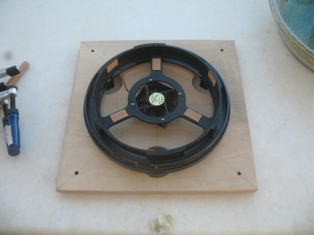 Καλησπέρα και πάλι. Αυτό το Σαββατοκύριακο κατάφερα να ολοκληρώσω την κατασκευή του κυρίως σώματος του τηλεσκοπίου και (ο καιρός μου έκανε το χατήρι) να πραγματοποίησω και τις δοκιμές εστίασης, κόβωντας τελικά τα αντιστηρίγματα στο επιθυμητό, βάσει του σχεδιασμού μου, μήκος. Όπως είχα προαναφέρει, όσον αφορά το mirror box, δεν είχα ασχοληθεί μέχρι στιγμής με τον πάτο του κουτιού , στον οποίο θα βίδωνα το εργοστασιακό κελί του κατόπτρου. Επειδή ήθελα να είναι αποσπώμενος, αποφάσισα να κολλήσω τέσσερις τριγωνικές γωνίες στο κάτω μέρος του mirror box , οι οποίες φέρουν καρφωτά περικόχλια Μ6 στην εσωτερική τους επιφάνεια και ο πάτος βιδώνεται με 4 εξάγωνες βίδες M6, όπως φαίνεται στις φωτογραφίες που ακολουθούν. Το κελί βιδώθηκε στον πάτο με 3 εξάγωνες βίδες στις θέσεις των locking screws του κελιού. Οι γωνίες συγκράτησης του πάτου μέσα από το mirror box Πρόσοψη του πάτου με το κελί Ο πάτος του mirror box με το κελί του πρωτεύοντος πάνω Γωνίες στο mirror box για την στερέωση του πάτου