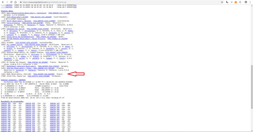 Καλημέρα σε όλους και σας ευχαριστώ πολύ!! Κώστα έχουν δίκιο όσοι σου είπαν να πας σε πιο κοντό σωλήνα. Δεν κάνει το SW για φωτογραφία λόγω μήκους, αν και με πολύ καλό ζύγισμα και πολική έχω πετύχει εκθέσεις των 2 min και νομίζω ότι έπαιρνε και άλλο λίγο..Απλά επειδή είναι γρήγορο τηλεσκόπιο f/4.7, χρειάζεσαι λιγότερο χρόνο απ’ ότι τα υπόλοιπα. Εγώ βέβαια το χρησιμοποιώ σε σε πολύ πιο μικρές εκθέσεις οπότε δεν με ενδιαφέρει για φωτογράφιση..Έχω το ED80.. Και ένα τελευταίο update…Ο αστεροειδής με την κωδική ονομασία C05T6Y1 που είχα παρατηρήσει, πήρε τελικά την τελική του ονομασία που είναι 2013 EX27 , αφού προσδιορίστηκε πλέον η τροχιά του. Πρόκειται για ένα αστεροειδή με διάμετρο περίπου στα 50m και σε απόσταση 90.000.000Km. Στη σελίδα https://www.minorplanetcenter.net/mpec/K19/K19G04.html βλέπουμε το φύλλο με το οποίο ανακοινώνεται ο αστεροειδής, όλες τις μετρήσεις που πάρθηκαν, τα αστεροσκοπεία που συμμετείχαν στον καθορισμό της τροχιάς καθώς και τα φυσικά χαρακτηριστικά του αστεροειδή. Τέλος σημειώνονται και οι αποκλίσεις των μετρήσεων κάθε αστεροσκοπίου από την τελική τροχιά, που μετρούνται σε sec του arc (!!) και βλέπουμε ότι παρόλο ότι είχα το μικρότερο σε διάμετρο τηλεσκόπιο, η απόκλιση ήταν πολύ μικρή. Με τις μετρήσεις αυτές κατόρθωσα να μπω στο κλάμπ των 153 αστεροσκοπίων ( επαγγελματικών και ελαχίστων ερασιτεχνικών) σε όλο τον κόσμο που ψάχνουν για αστεροειδείς και κομήτες όπως φαίνεται στο παρακάτω link: http://neocp.jostjahn.de/?fbclid=IwAR3x-7h2vdwLmGc_XgXaXfMO4yTZMyrlgNGSHFJCjOSTlw4g-UgsTcLxTkA Η τροχιά του 2013 EX27 -