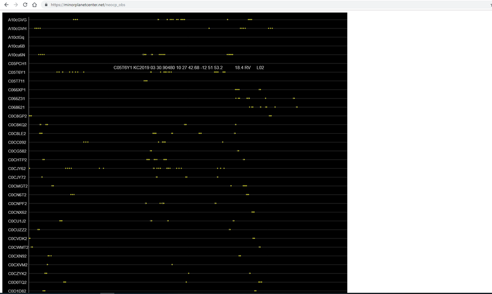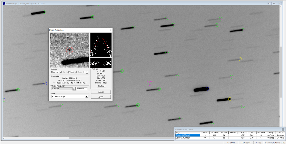 Για πρώτη φορά στην Ελλάδα τόσο σε ερασιτεχνικό, όσο και σε επαγγελματικό επίπεδο έγινε καταγραφή ενός NEOCP (μεγέθους 19.2 mag) από το αστεροσκοπείο ΝΟΑΚ (MPC-NASA L02), δηλαδή ενός αστεροειδούς που ανακαλύφθηκε μόλις προχθές από τα μεγάλα αυτοματοποιημένα τηλεσκόπια όπως τα CATALINA SKY SURVEYS και ATLAS -MLO. Τα αντικείμενα αυτά παίρνουν μια προσωρινή ονομασία και από εκεί και πέρα η NASA, διάφορα αστεροσκοπεία από όλο τον κόσμο, ακόμα και ερασιτέχνες αστρονόμοι, κάνουν μετρήσεις ώστε να προσδιορίσουν με όσο το δυνατόν μεγαλύτερη ακρίβεια γίνεται την τροχιά του συγκεκριμένου αντικειμένου. Αν μάλιστα η τροχιά, διασταυρώνεται με αυτή της Γης μπαίνει σε λίστα υψηλής προτεραιότητας. Όταν η τροχιά του καθοριστεί πλήρως, παίρνει πλέον και την επίσημη ονομασία του και μάλιστα εγγράφονται και όλα τα αστεροσκοπεία που συνέβαλλαν στο να επιτευχθεί ο στόχος. Στην παρακάτω διεύθυνση μπορείτε να παρακολουθήσετε ένα αντιπροσωπευτικό βίντεο, που δείχνει ακριβώς με ποιο τρόπο συμμετέχω στην προσπάθεια της NASA να καταγράψει όλα τα αντικείμενα που βρίσκονται στο ηλιακό μας σύστημα. https://www.jpl.nasa.gov/edu/learn/video/how-does-nasa-spot-a-near-earth-asteroid/?utm_source=iContact&utm_medium=email&utm_campaign=nasajpl-edu&utm_content=edunews_20181213 Με τον τρόπο αυτό γίνεται μια χαρτογράφηση όλων των αντικειμένων που υπάρχουν στο ηλιακό μας σύστημα ώστε να γνωρίζουμε αν κάποιο από αυτά αποτελεί κίνδυνο για τη Γη. Μέχρι στιγμής δεν έχουμε βρει κάτι ανησυχητικό!! Επομένως: EARTH IS SAFE Όλες οι μετρήσεις που καταχωρούνται στο MPC Ένα screenshot του πως βρήκα τον αστεροειδή Τα αστεροσκοπεία που συμμετείχαν στη μελέτη -