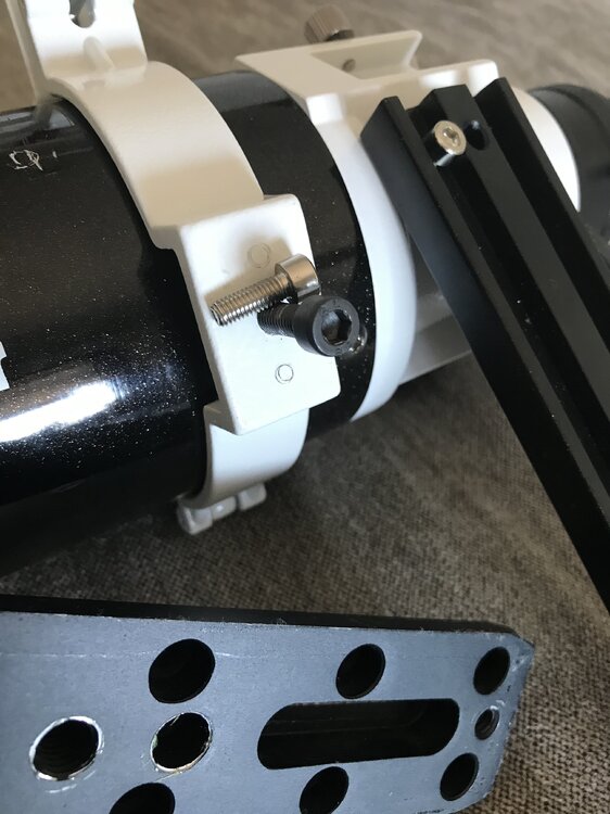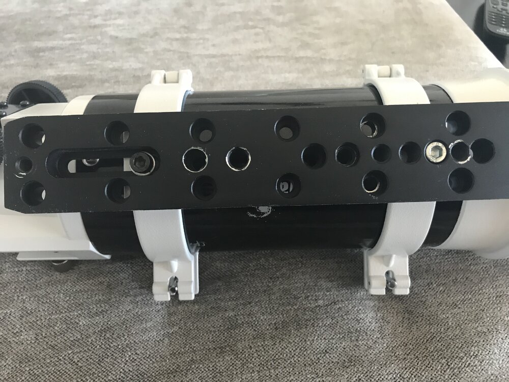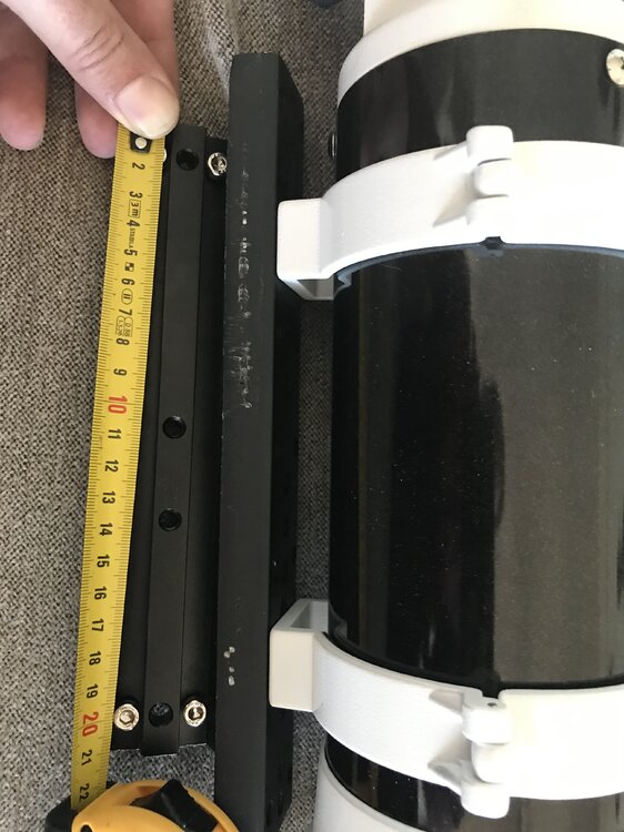 Aν εχει τα δακτυλιδια της μανας του, που παιρνει μια βιδα 5χιλιοστων σε καθε δαχτυλιδι το 21 δεν κανει ,γιατι οι βιδες του ειναι 4χιλιοστα! Αν τα δαχτυλιδια περνουν βιδεσ 4χιλιοστα μπαινει στο 21, ετσι οπωσ το εχεις στη φωτο.. με τα δαχτυλιδια κολητα στις δυο μεσαιες τρυπες του Dovetail η στην πρωτη (που δεν εχει βολτες) και στην δευτερη απο τις κεντρικες ( Η ιδανικη αποσταση απο βιδα σε βιδα ειναι των δαχτυληδιων ειναι 13cm μεχρι 17 το πολυ! Στα 18,5 mm που βρισκονται οι δυο οπες του 21 Dovetail το πισω δαχτυλιδι βρισκει στις βιδεσ του σωληνα στο πισω μερος του τηλεσκοπιου..! Συμπερασμα.., ακομα και με τα ιδανικα δαχτυλιδια τοποθετημενα στο 21 Dovetail κανονικα στα 2 ακριανα ζευγη βιδων. το πισω δαχτυλιδι θα βρισκει στις βιδες του σωληνα πισω! Η καλητερη λυση ειναι TS-OPTICS (Dovetail), τύπου Vixen GP - 180mm με οπες για μεταβαλομενεσ σε θεση, (συρομενες βιδες!) ( ΜΕ ΕΧΕΙ ΒΟΛΕΨΕΙ)