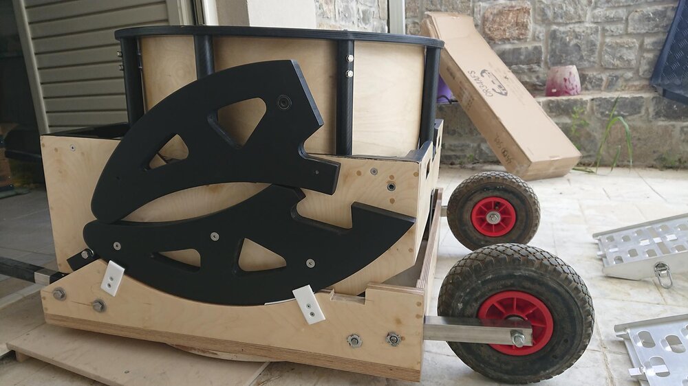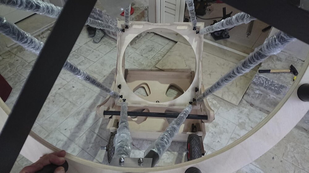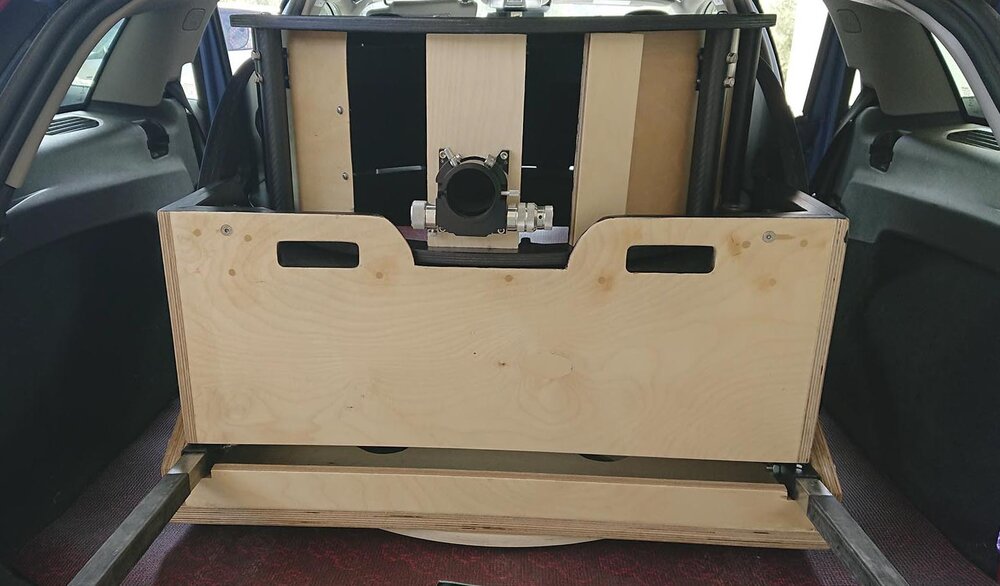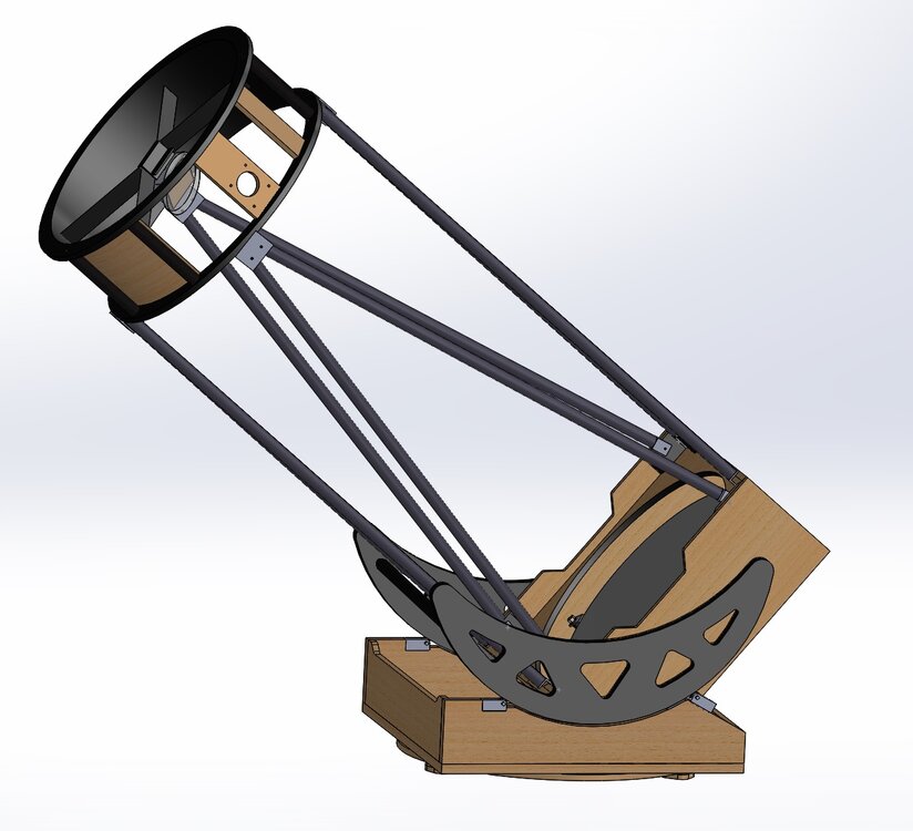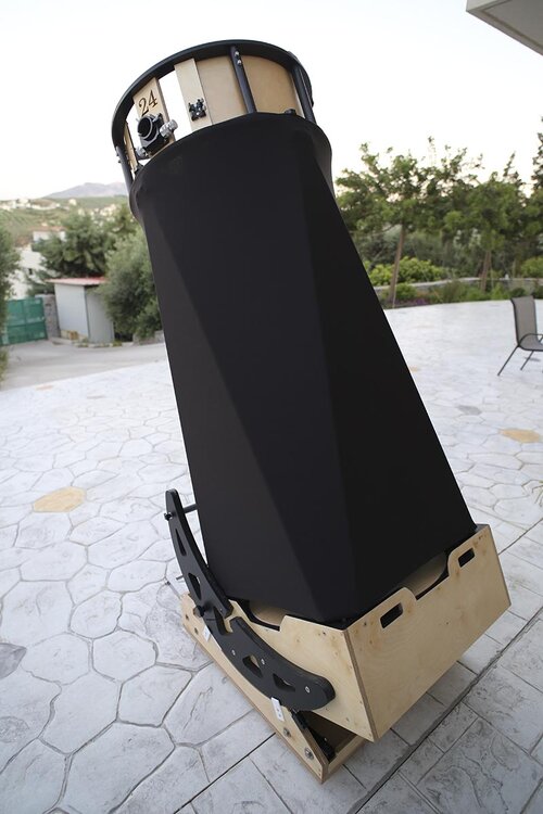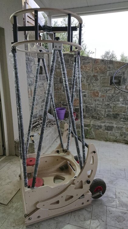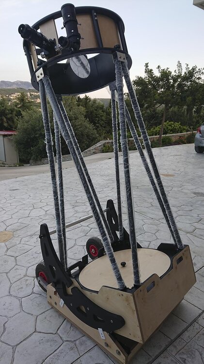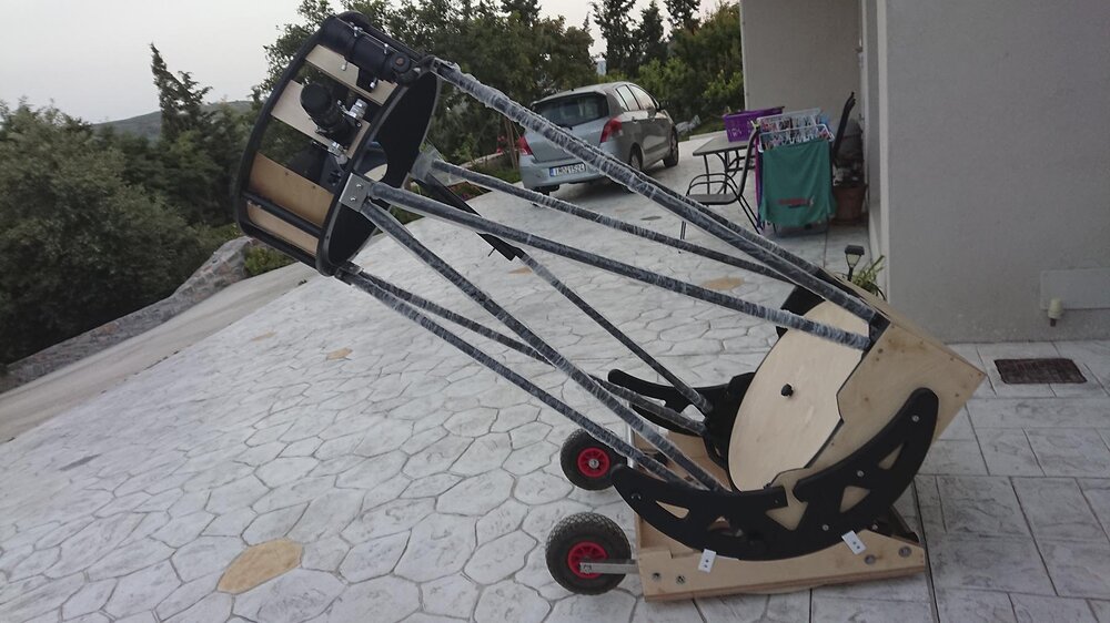 Αυτές τις μέρες έχω ασχοληθεί πολύ με την κατασκευή. Προσπαθώ να βελτιστοποιήσω τις διαστάσεις του ώστε να είναι όσο γίνεται μικρότερο και ευκολότερα διαχειρήσιμο. Οι μπάρες με τους τροχούς να μπουν μέσα χωρίς να ενοχλούν την κίνηση του mirror box, η βάση να είναι όσο γίνεται πιο χαμηλή για ελαχιστοποίηση του ύψους. Στόχος είναι τώρα να μπαίνει στο αμάξι όλο μαζί (βάση + mirror box + upper cage), κάτι που είναι πολύ οριακό για το δικό μου αμάξι με μόνο 63 εκατοστά ύψος στις άκρες του πλάτους του τηλεσκοπίου.