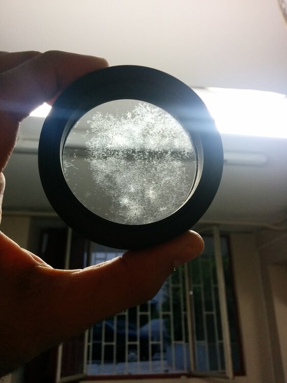 Καλησπέρα, Εδώ και 1 χρόνο περίπου έχω ένα FS-60CB. Σε γενικές γραμμές είμαι πλήρως ευχαριστημένος (για την χρήση που του κάνω) αν και δεν θεωρώ πως έχω πιάσει ούτε κατ'ελάχιστο τις δυνατότητες του. Εδώ και 4 μήνες εμφανίστηκε στη πλευρά του σωλήνα, στην εξωτερική επιφάνεια, πάνω στο φακό μια περίεργη δομή που στην αρχή πίστευα ότι ήταν σκόνη. Μετά απο ψάξιμο (και εξάπλωση) είμαι σχεδόν σίγουρος οτι πρόκειται για μύκητα (!). Δείτε φωτό, μιλάει απο μόνη της. Το έκανα ώρες expose σε UV, και μετά απο φύσημα δεν φένεται να φεύγει κάτι. Ιδέες; [/img]