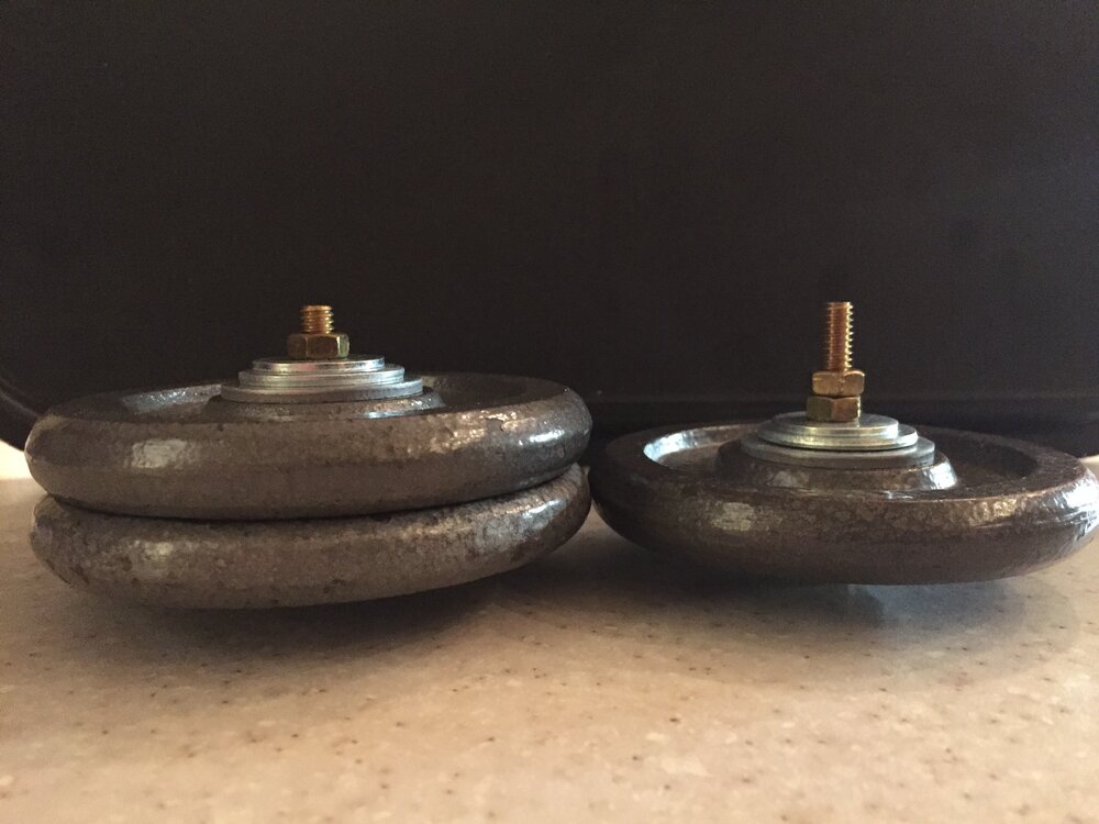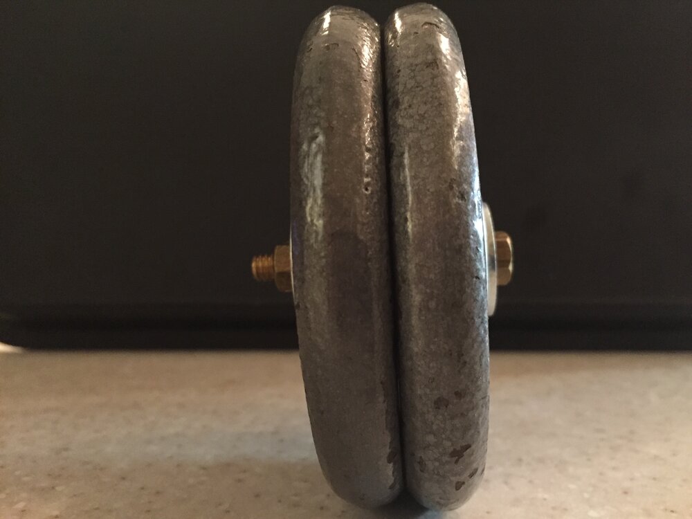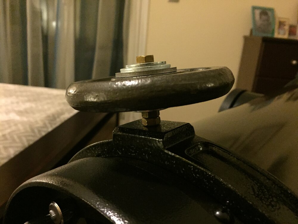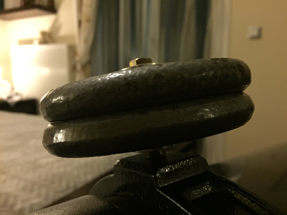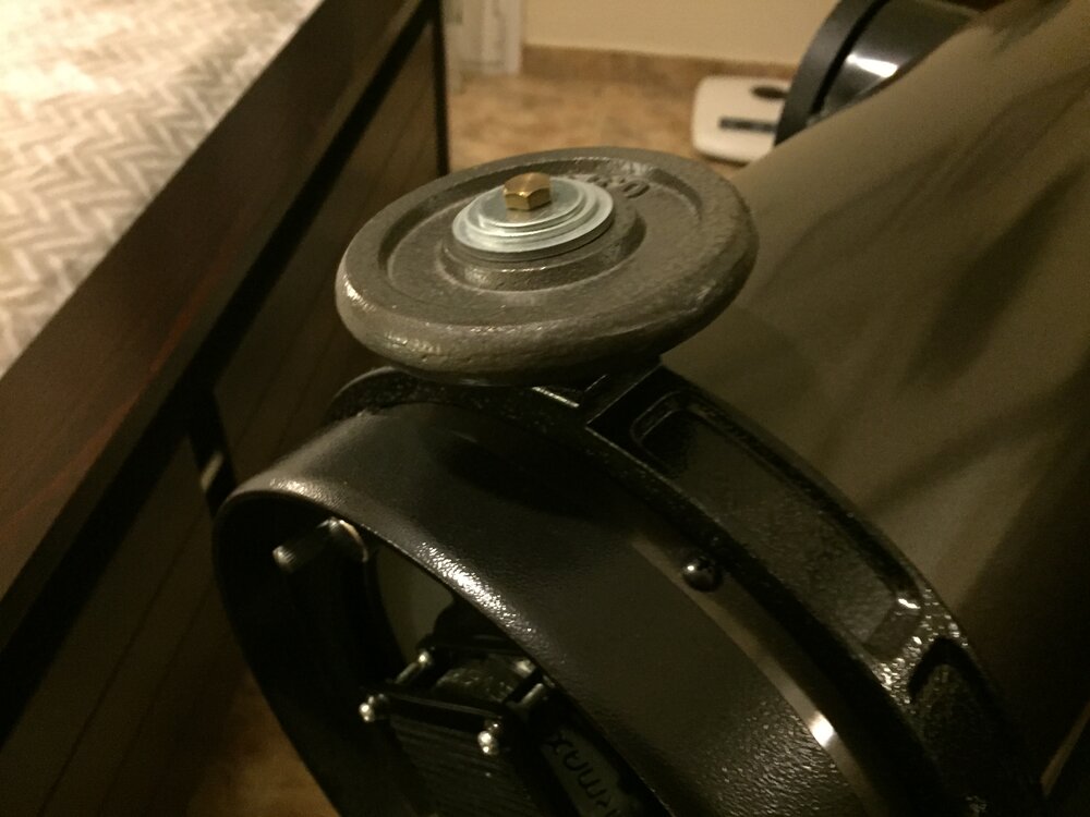 Όπως είχα αναφέρει σε προηγούμενο post (/forum/viewtopic.php?t=23374&postdays=0&postorder=asc&start=15), ο δεύτερος δακτύλιος του οπτικού σωλήνα του 8" dobsonian χρησιμοποιήθηκε ως βάση για το βίδωμα αντίβαρων. Ως αντίβαρα χρησιμοποιήθηκαν τρεις δίσκοι μισού κιλού που χρησιμοποιούνται ως όργανα γυμναστικής (βαράκια) με κόστος περίπου 1 ευρώ ο ένας. Δημιουργήθηκαν δύο αντίβαρα, ένα μισού κιλού και ένα ενός κιλού, χρησιμοποιώντας βίδα συμβατού σπειρώματος διαφορετικού μήκους για κάθε ένα αντίβαρο, αλλά και ροδέλες διαφορετικού διαμετρήματος, ούτως ώστε να προσαρμοστεί η συνολική ιδέα στην μεγάλη διάμετρο που έχουν τα βαράκια. Τα τελικά αποτελέσματα φαίνονται στις παρακάτω φωτογραφίες. Η λύση είναι απόλυτα σίγουρη ως προς το βίδωμα και ως εκ τούτου σταθερή. Επιπλέον ο χρόνος προσαρμογής του αντίβαρου πάνω στον σωλήνα είναι πολύ μικρός. Το αντίβαρο του ενός κιλού πάνω στον σωλήνα Λεπτομέρεια του αντίβαρου του μισού κιλού Λεπτομέρεια του αντίβαρου του ενός κιλού (πλάγια όψη) Λεπτομέρεια του αντίβαρου του ενός κιλού Τα δύο αντίβαρα Λεπτομέρεια του αντίβαρου του μισού κιλού πάνω στον σωλήνα Το αντίβαρο του μισού κιλού πάνω στον σωλήνα