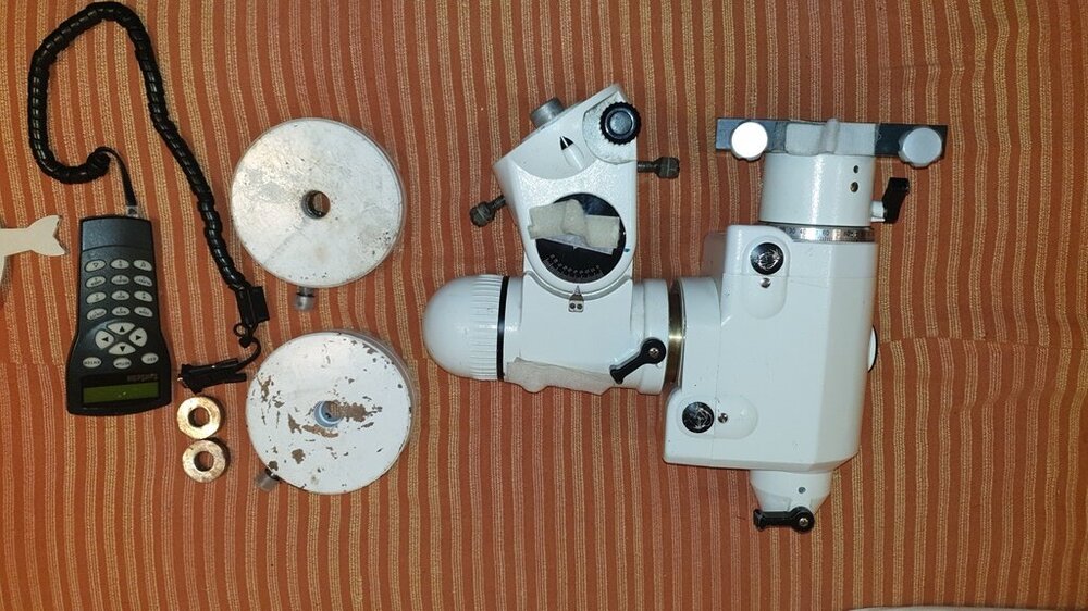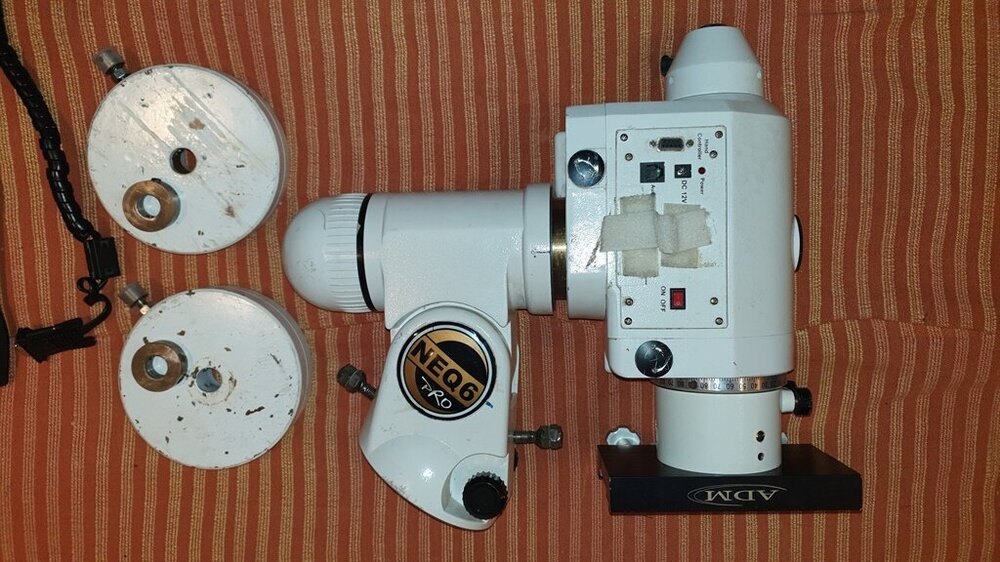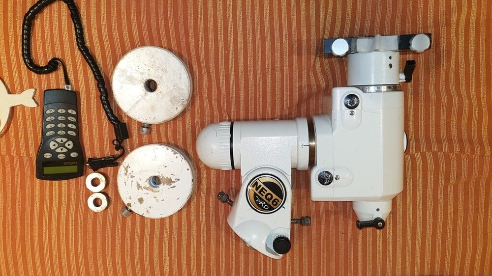 Καλησπέρα, προς πώληση η NEQ6 που χρησιμοποιήσα στις λίγες εξορμήσεις μου. Δίνεται με 2 αντίβαρα των 5 κιλών, χειριστήριο (που αναβαθμίζεται), τρίποδο και 2 custom βάσεις για να σταθεροποιηθούν τα αντίβαρα και να μην κουνιούνται κατά την χρήση. Οι αρχικές βίδες ανύψωσης δεν υπάρχουν και έχω φτιάξει δικές μου. To ίδιο και για τα αντίβαρα. Η βάση εξωτερικά είναι λίγο ταλαιπωρημένη, λειτουργεί όμως άψογα. Η πολική διόπτρα της είναι ρυθμισμένη και ευθυγραμμισμένη. Δεν έχω τροφοδοτικό γιατί την χρησιμοποιούσα με powerbox. Επίσης από το τρίποδο έχουν σπάσει τα 2 από τα 3 σφικτηράκια που κρατάνε τα πόδια πιο ψηλά. Με μια πένσα σφίγγουν όμως κανονικά. Δίνεται με το saddle της ADM που κάνει για vixen και losmandy dovetails. Την βάση την είχα αγοράσει από μέλος του φόρουμ. Τελίκή τιμή 500 ευρώ. Λόγω βάρους θα προτιμούσα η συναλλαγή να γίνει χέρι με χέρι. Ευχαριστώ Η βάση πουλήθηκε