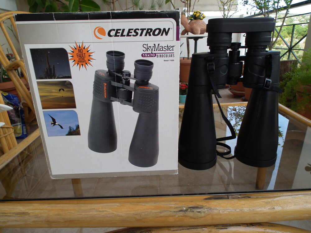 Κιάλια CELESTRON 15X70 πωλούνται 50€ ή ανταλλάσσονται με άλλα είδη αστρονομικού ενδιαφέροντος π.χ. προσοφθάλμια Τα οπτικά είναι άψογα και ευθυγραμμισμένα, δεκτός κάθε έλεγχος και ειδικά προτείνεται βραδυνή παρατήρηση των Πλειάδων όπου αξιοποιείται το ευρύ οπτικό τους πεδίο (φαίνονται όλες οι Πλειάδες) και οι μεγάλοι αντικειμενικοί (σε απευθείας σύγκριση με άλλα κιάλια, φαίνεται μεγαλύτερο πλήθος αστέρων από ότι στα άλλα κιάλια που έχουν αντικειμενικούς φακούς μικρότερης διαμέτρου). Η χαμηλή τιμή οφείλεται σε ένα κομμάτι πλαστικού που έσπασε και κολλήθηκε με αποτέλεσμα κακή εμφάνιση σε εκείνο το σημείο, χωρίς να έχει επηρεαστεί η οπτική απόδοση. Μόνο από Αττική για να γίνει έλεγχος στην παράδοση, κάθε έλεγχος δεκτός. -