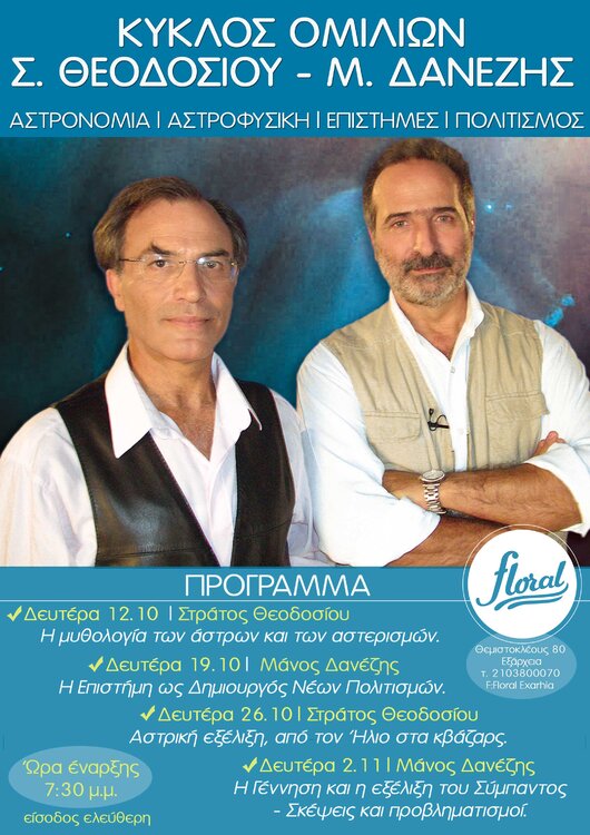ΟΚΤΩΒΡΗΣ 2015 ΚΥΚΛΟΣ ΔΙΑΛΕΞΕΩΝ  Για την ΑΣΤΡΟΝΟΜΙΑ, την ΑΣΤΡΟΦΥΣΙΚΗ, τις ΕΠΙΣΤΗΜΕΣ και τον ΠΟΛΙΤΙΣΜΟ Με τον Στράτο Θεοδοσίου και τον Μάνο Δανέζη Δευτέρα 12, 19, 26 Οκτώβρη & 2 Νοεμβρίου, στις 19:30   Μια μοναδική ευκαιρία να γνωρίσετε τον κόσμο των αστερισμών, του σύμπαντος, των επιστημών και του πολιτισμού, μέσα από τέσσερις πρωτότυπες διαλέξεις, με την καθοδήγηση δύο αναγνωρισμένων επιστημόνων του χώρου. Ο Στράτος Θεοδοσίου είναι αστροφυσικός, αναπληρωτής καθηγητής στο ΕΚΠΑ και Πρόεδρος της Ένωσης Ελλήνων Φυσικών. Ο Μάνος Δανέζης είναι επίκουρος καθηγητής στο ΕΚΠΑ. Έχουν παρουσιάσει πολυάριθμες επιστημονικές και μη δημοσιεύσεις, και έχουν συμμετάσχει σε συνέδρια, διαλέξεις και παρουσιάσεις επιτυχημένων τηλεοπτικών σειρών με θέματα σχετικά με τις επιστήμες («Το σύμπαν που αγάπησα» -107 επεισόδια και «Έτσι βλέπω τον Κόσμο» - 16 επεισόδια με αντίστοιχη επιστημονική θεματολογία στην ΕΤ3). Είναι επίσης συγγραφείς πολλών επιτυχημένων βιβλίων που κυκλοφορούν από τις εκδόσεις Δίαυλος.   Διαβάστε περισσότερα για τους καθηγητές και τα βιβλία τους: Στράτος Θεοδοσίου: http://www.stratos-theodosiou.gr/ http://www.diavlos-books.gr/author.asp?catid=277&title=stratos-theodosioy http://www.diavlos-books.gr/author.asp?catid=413&title=manos-danezis,-stratos-theodosioy-   Μάνος Δανέζης: http://www.diavlos-books.gr/author.asp?catid=413&title=manos-danezis,-stratos-theodosioy- http://manosdanezis.gr/   Videos:
