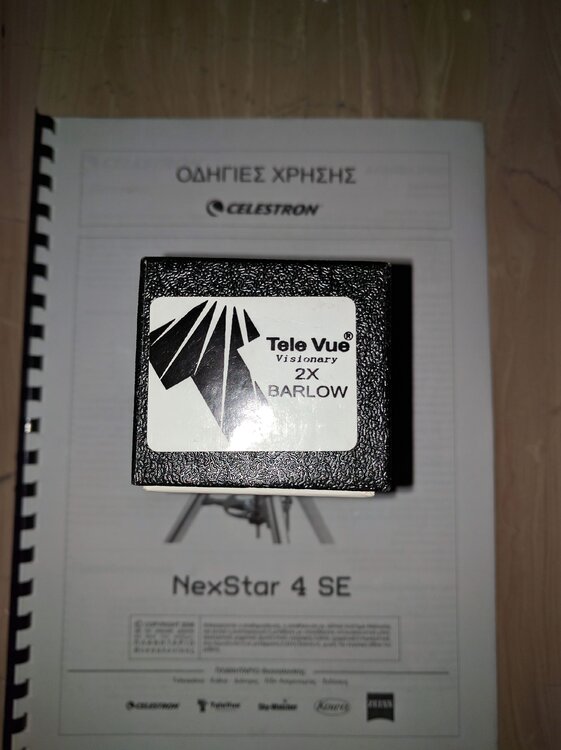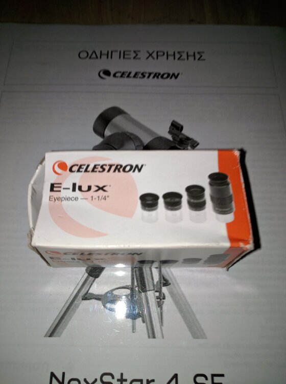 Πουλήθηκε ρομποτικό NexStar 4SE ελάχιστα χρησιμοποιημένο με πολλά αξεσουάρ Χρησιμοποιώντας την κατοχυρωμένη με δίπλωμα ευρεσιτεχνίας τεχνολογία NexStar® τα τηλεσκόπια SE έχουν την ικανότητα να εντοπίσουν περίπου 40.000 αντικείμενα. Το μόνο που έχετε να κάνετε είναι να κοιτάξετε μέσα από το προσοφθάλμιο και να απολαύσετε το θέαμα!Δεν ξέρετε ποιο αντικείμενο να επιλέξετε; Αφήστε το πολυμήχανο NexStar SE να σας κάνει μια προγραμματισμένη περιήγηση στο νυχτερινό ουρανό! Η επιλογή “Tour” προσφέρει μια λίστα των πιο ενδιαφερόντων ουράνιων αντικειμένων προσαρμοσμένη στο χρόνο που θα επιλέξετε και στη δική σας τοποθεσία οπουδήποτε στον κόσμο!Το NexStar SE μπορεί όχι μόνο να βρίσκει αντικείμενα αλλά και να σας διδάξει σχετικά με αυτά. Στην οθόνη LCD του χειριστηρίου σας μπορείτε να δείτε πληροφορίες για τα πιο δημοφιλή αντικείμενα. Σύνδεση με pc Τεχνικά Χαρακτηριστικά: Καθ.Βάρος (γρ.) 9.5 kg Μάρκα CELESTRON Οπτικός Σχεδιασμός Καταδιοπτρικό Maksutov-Cassegrain Διάμετρος (mm) 102 Εστιακή Απόσταση - F (mm) 1325 Εστιακός Λόγος (f/) 13 Στήριξη Αλταζιμουθιακή Ρομποτική GoTo Ερευνητής Κόκκινης Κουκίδας (Star Pointer) Διαγώνιο Πρίσμα / Κάτοπτρο 90º Κάτοπτρο, 31.8mm Μέγιστη Ωφέλιμη Μεγέθυνση (x) 240 Προσοφθάλμιο E-Lux 25mm (53x), Ø31.8mm Μαζί με το τηλεσκόπιο δίνονται: Φακός Απο την Televue visionary 2x BARLOW Ενα UltraWide 15mm Απο celestron eyepiece 1-1,4'' Φίλτρο Nebula 1 1/4'' Οδηγίες χρήσης στα ελληνικά NightWatch Πρακτικός οδηγός Με απόδειξη αγοράς Πωλείται συνολικά 480 € τηλ. 6947449404 [/img]