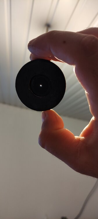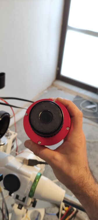 Ώντας απογοητευμένος από τα φτωχά αποτελέσματα των οργάνων ευθυγράμμισης που είχα για την ευθυγράμμιση των κατόπτρων του f4 νευτωνειου μου και ώντας επιφυλακτικός στην αγορά νέων ακριβότερων (ίσως και ακριβότερων από το ίδιο το τηλεσκοπιο) οργάνων με το ρίσκο να δώσουν και αυτά φτωχά αποτελέσματα, άρχισα να βασανίζω το μυαλό μου με το πώς θα μπορούσα να κάνω την ευθυγράμμιση -ιδανικα- με χρήση της ίδιας της κάμερας που χρησιμοποιώ για φωτογραφία.. Το Ocal που κυκλοφορεί τον τελευταίο καιρό φαίνεται να δίνει αποτελέσματα αλλά πέρα από το υψηλο κόστος του δεν διασφαλίζει ότι η κάμερα θα "κάτσει" με παρόμοιο τρόπο στον εστιαστη αλλά η ιδέα ενός έξτρα φακού μεταξύ του οπτικού μονοπατιού και της κάμερας δεν ήταν καθόλου άσχημη.. Η λύση ήρθε όταν το James Webb έφτασε στο L2 και έβγαλε την πρώτη φωτογραφία του.. παραδόξως αυτή δεν ήταν κάποιου αστεριού αλλά ήταν μια "σελφι" των κατόπτρων του! Άρχισα λοιπόν να ψάχνω να δω πως το κατάφεραν αυτό οι τύποι της νασα και τί υψηλή τεχνολογία υπήρξε πίσω από αυτή την φωτό! Αντ'αυτου απο διάφορα σχόλια στα φόρα, και από τα διάφορα άρθρα που διακινούσαν την φωτογραφία φαινόταν ότι το πιθανότερο ήταν να χρησιμοποίησαν απλά μια οπή μπροστά από τον κύριο αισθητήρα! Ψάχνοντας ακόμα περισσότερο ώστε να επιβεβαιώσω ότι αυτό είναι δυνατόν να γίνει, βρήκα μια δημοσίευση από ένα παρατηρητήριο στη Ταϊλάνδη που είχαν κάνει κάτι αντίστοιχο αλλα για τελείως διαφορετικό λόγο. Άρχισε λοιπόν να έχει νόημα μιας και αν μπορούσα να βάλω μια πολύ μικρή οπή στον οπτικό άξονα κοντά στον αισθητήρα θα μπορούσα να έχω όλο το πεδίο εστιασμένο αφού μιλάμε για τεράστιους εστιακους λόγους.. Κάθισα και έφτιαξα ένα δαχτυλίδακι M48 στο openscad, το τύπωσα στο 3D printer, έκοψα ένα δίσκο απο ένα φύλλο αλουμινίου πάχους 0.3mm να πατάει πάνω στο δαχτυλιδι και το έβαψα μαύρο. Άνοιξα μια τρύπα στο κέντρο διαμέτρου 0.3mm και τα φόρεσα σε έναν από τους αποστάτες της ASI294 ώστε να έρχεται όσο πιο κοντά στον αισθητήρα (περίπου 30 mm) με ένα εστιακό λόγο κάπου στο f100 . Αφού τράβηξα μια φωτό τον εαυτό μου και είδα ότι δουλεύει καλά, φόρεσα όλο το σύστημα (κάμερα αποστάτες διορθωτή κόμης) στο τηλεσκόπιο. Το αποτέλεσμα είναι εκπληκτικό! Αν δείτε από τις φωτογραφίες. Η διαδικασία ευθυγράμμισης που ακολουθώ είναι παρόμοια με αυτή που γίνεται με το Ocal. Το 2ον κάτοπτρο ευθυγραμμίζει πολύ καλα με την βοήθεια του mire de collimation αλλα στο στο πρωτεύον υπάρχει ένα θεματακι αφού η οπή δεν φαίνεται καν (σε αντίθεση με τον φακό του Ocal που είναι εμφανεστατος). Έτσι τροποποίησα λίγο την εξωτερική πλευρά της επιφάνειας της οπής ώστε να να είναι ανακλαστική με ένα φύλλο αλουμινόχαρτο (τελευταία φωτο). Τώρα όλα τα μερη φαίνονται ξεκάθαρα και μπορώ να τα φέρω σωστα (μπορώ όντως?) ..μένει και να δουλέψει στην πράξη. Σε τεσταρισμα με ένα δανεικό concenter (ευχαριστώ Δημήτρη) που κατάφερα να το βάλω στην ίδια απόσταση με την απόσταση που εστιάζει η καμερα (ναι και ο εστιαστης δεν είναι απόλυτα ορθός) φαίνονται όλα σωστά. Στο επόμενο επεισόδιο θα βγάλω και μερικές φώτο από τα ευθυγραμμισμένα κάτοπτρα για να ακούσω σχόλια.. Επίσης, αν κάποιος έχει κάνει κάτι αντίστοιχο ή έχει γενικότερη εμπειρία επ' αυτού ας κάνει κάποιο σχόλιο γιατί βαδίζω λίγο στα τυφλά..
