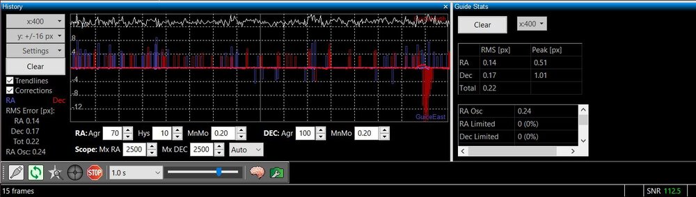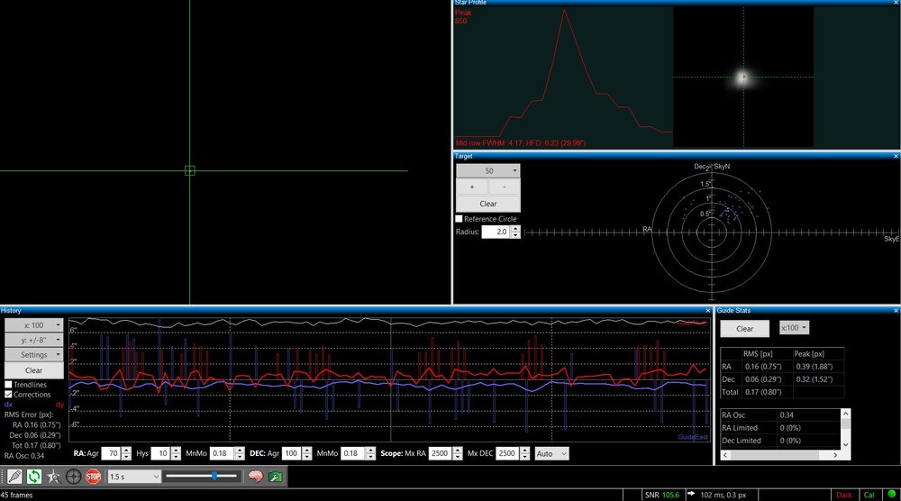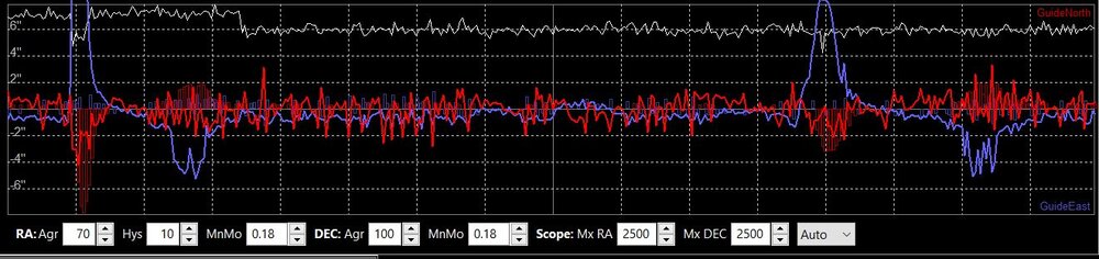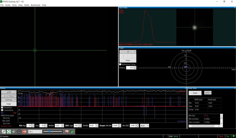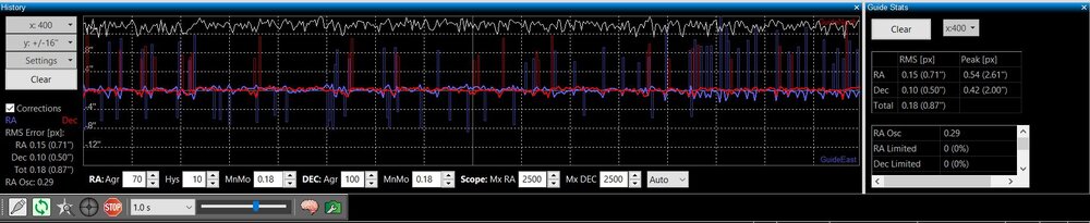 Καλησπερα και παλι, Οχι οσο ωραια βραδυα σαν την χθεσινη η σημερινη αλλα ειπα να το στησω και να δοκιμασω παλι. Απ οτι φαινεται οι αριθμοι ηταν σωστοι εχθες σε οτι αφορα το pixel RMSE. Σημερσ εβαλα και τα σωστα settings στο phd2 για να δειχνει σωστα το σφαλμα σε arc-sec. Λιγο πιο κακο το seeing σιμερα και με λιγο αερακι αλλα το phd σταθερα με RMSE 0.18px (0.8 arc-sec) Τελικα φαινεται να οδηγει μια χαρα η βασουλα αυτη