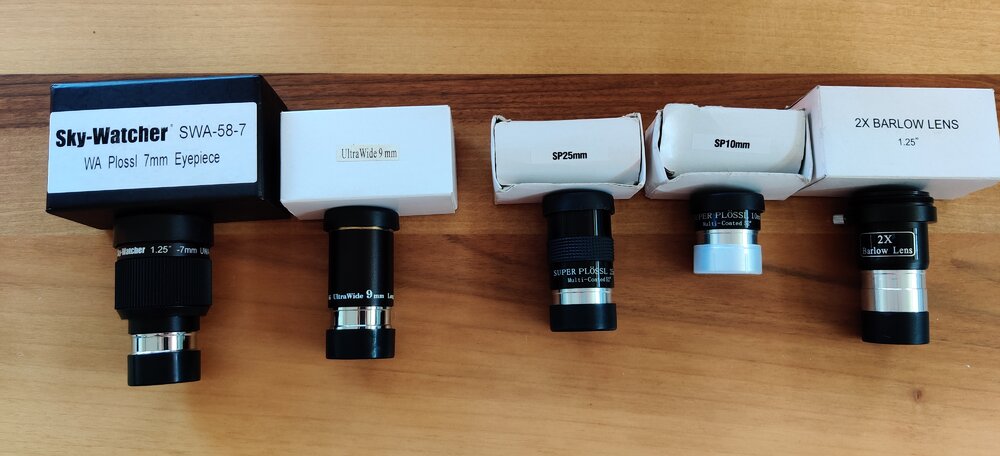 7. Πωλείται skywatcher dobsonian 8". Το τηλεσκόπιο έχει αγοραστεί από το πλανητάριο. Το έχω 2 χρόνια, είναι σε άριστη κατάσταση και δίνεται μαζί με το κουτί του. Το χρησιμοποιώ κυρίως από το μπαλκόνι του σπιτιού μου και το έχω μετακινήσει 6-7 φορές συνολικά εκτός σπιτιού οπότε δεν έχει ταλαιπωρηθεί σχεδόν καθόλου σε μετακινήσεις. Το δίνω όπως το αγόρασα, δηλαδή με τα 2 προσοφθάλμια που είχε μαζί, τα super plossl 10mm και 25mm και δίνω επιπλέον 1 barlow 2X και 2 προσοφθάλμια skywatcher 9mm ultrawide και 7mm που όλα μαζί συνθέτουν ένα πακέτο που δίνει αρκετές επιλογές. Η τιμή όλα μαζί πακέτο είναι 380€ και χωριστά οι τιμές είναι: Το τηλεσκόπιο μαζί με τα 2 αρχικά προσοφθάλμια --> 300€ Barlow 2X 30€ barlow2X Προσοφθάλμιο Skywatcher Ultra wide 9mm 40€ 9mm Προσοφθάλμιο Skywatcher Plossl 7mm 40€ 7mm
