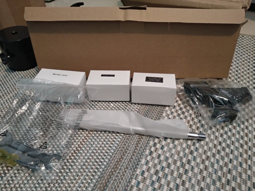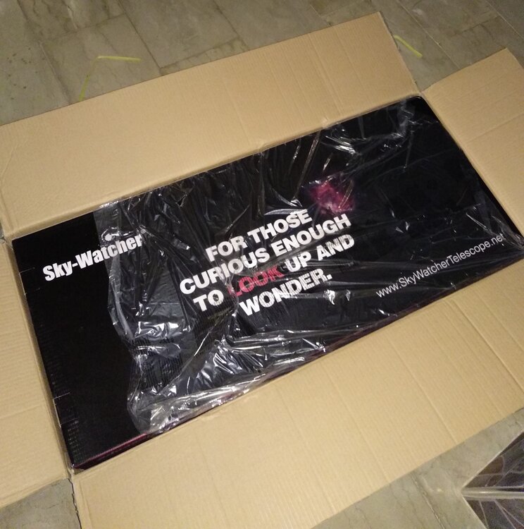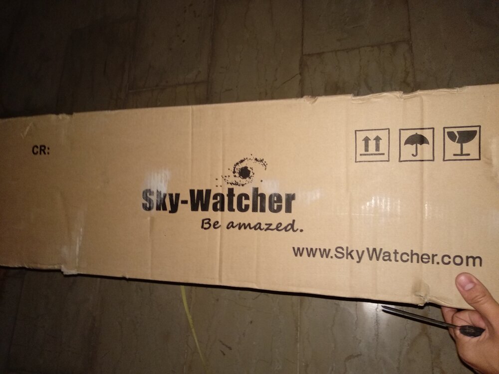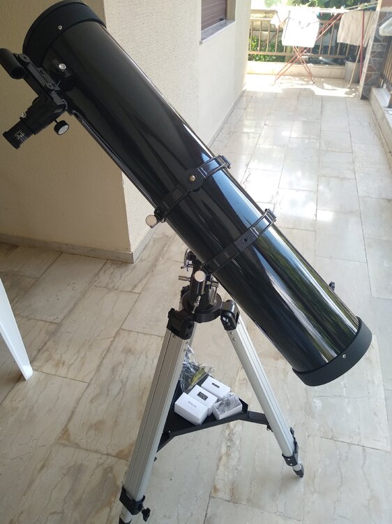 Ήρθε εχθές το απόγευμα. Σήμερα το πρωί το άνοιξα και το έστησα! Πολύ στιβαρή κατασκευή, τόσο της βάσης όσο και του ίδιου του σωληνα. Μόνο κάποιες λεπτομέρειες έχω να παρατηρήσω: - Τα πλαστικά καλύμματα των προσοφθάλμιων ή του εστιαστή είναι λίγο χοντροκομμένα, αλλά δεν εμφανίζουν κάποιο πρακτικό πρόβλημα. - Νιώθω πως το μέταλο του σωληνα με κάποιο χτύπημα θα λυγίσει. Το red dot finder, μετά από την ευθυγράμμιση που του εκανα, δουλεύει άψογα. Τώρα το μόνο που το περιμένει είναι το πρώτο του φως. Ελπίζω σήμερα το βράδυ να μην έχει συννεφιά και βρω την ευκαιρία να δω οτιδήποτε. Παραθέτω κάποιες φωτογραφίες από το τηλεσκόπιο, αλλά και ότι είχε το κουτί.