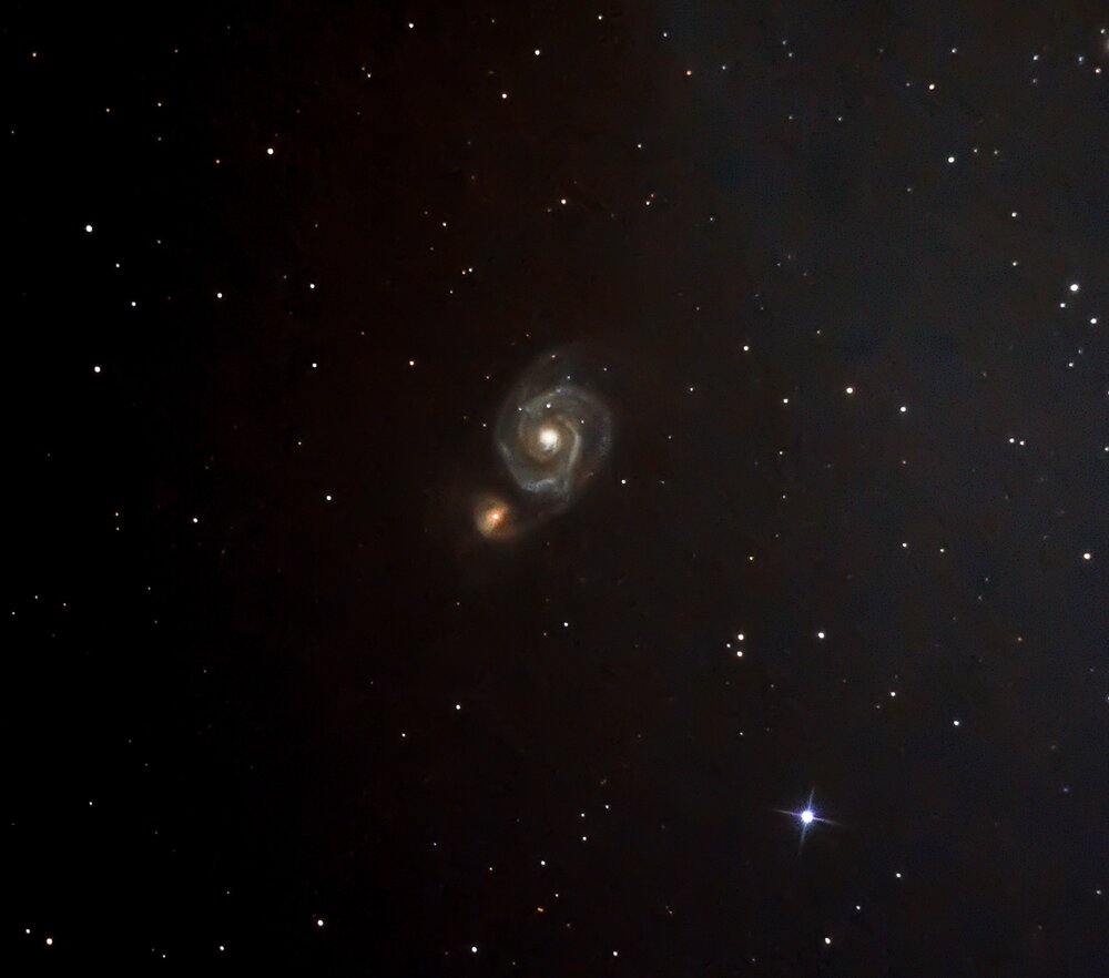 1. Με ευκαιρία τη καραντίνα και τον αρκετό χρόνο που έχω επιτέλους κατάφερα να λύσω κάποια προβλήματα στον εξοπλισμό κυρίως λόγο απειρίας. Σαν πρώτο στόχο είχα το γαλαξία της δίνης-m51 και μπορώ να πω ότι είμαι πολύ ευχαριστημένος για πρώτη προσπάθεια! Βέβαια απέχει αρκετά από δικά σας αποτελέσματα αλλά μου έδωσε κουράγιο να συνεχίσω γιατί είχα αρχίσει και απογοητευόμουν από τα λάθη που έκανα. Χρησιμοποίησα 10 lights των 30s σε 3200 iso, 10 darks και 10 bias. Ο εξοπλισμός μου ήταν η Nikon d3100, skywatcher 150/750 σε eq3 με μόνη οδήγηση από το goto. Το στακαρισμα το έκανα στο Dss και μετά επεξεργασία στο pixinsight και το lightroom. Δείξτε επιείκεια παρακαλώ!!