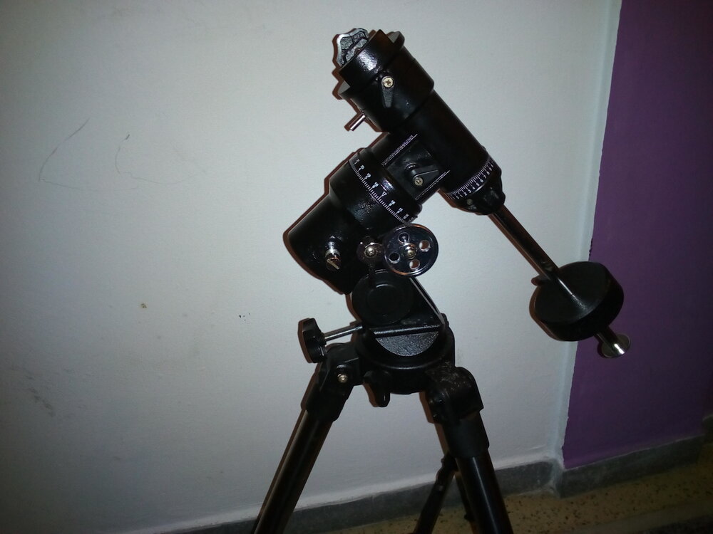 Όπως θα έχουν καταλάβει όσοι έχουν διαβάσει τα ελάχιστα ποστ που έχω κάνει κυνηγάω τις ευκαιρίες! Αποφάσισα, λοιπόν πριν λίγο καιρό ότι θα επενδύσω σε μια φθηνή ισημερινή στήριξη και μιας και το τηλεσκόπιο μου είναι ελαφρύ θεώρησα πως η eq1 θα μου είναι μια χαρά. Διαπίστωσα με λίγο ψάξιμο στο διαδίκτυο πως έβγαινε πιο φθηνά να πάρω κάποιο σαραβαλιασμένο τηλεσκόπιο με ισημερινή στήριξη παρά καινούρια eq1. Και αυτό έπραξα, με 42 ευρώ(με τα μεταφορικά) πήρα ένα Bresser 70/700 χωρίς προσοφθάλμια, με ένα διαγώνιο για πέταμα αφού έχει ένα απίστευτο σημάδι στο κάτοπτρο, και το οποίο τηλεσκόπιο αρνούμαι έστω και να δοκιμάσω γιατί είναι απίστευτα σκονισμένο και δε θέλω να κάνω ζημιά στα προσοφθάλμια μου. Η στήριξη του όμως, που ο τύπος στο e-bay έλεγε ότι είναι η eq1, αν και σκουριασμένη σε διάφορα σημεία και με δύο παξιμαδάκια στο τρίποδο να της λείπουν, με την κατάλληλη φροντίδα και με μπόλικο WD-40, εντάξει δεν έγινε και σαν καινούρια, αλλά έφυγε η πολλή σκουριά(απορώ πού το είχε πεταμένο το τηλεσκόπιο) και έγινε πλήρως λειτουργική. Καλά δεν το συζητώ ότι στις παρατηρήσεις το να χρησιμοποιείς ισημερινή σε σχέση με αλταζιμουθιακή στήριξη είναι μέρα με τη νύχτα! Απίστευτη ευκολία στο να ακολουθείς το αντικείμενο που θες. Έλα όμως που μάλλον δεν είναι η eq1. Νομίζω είναι ίδια με αυτές: εδώ περιγράφεται σαν eq-3 https://www.astroshop.eu/telescopes/bresser-telescope-ac-102-600-eq-3-at-3/p,43996#tab_bar_1_select , εδώ σαν eq-sky https://www.astroshop.eu/telescopes/bresser-telescope-ac-70-900-lyra-eq-sky/p,4132#tab_bar_1_select και εδώ σαν eq 3-1 https://www.teleskop-express.de/shop/product_info.php/info/p684_TS-Optics-Newtonian-114-900mm-EQ3-1---complete-telescope-for-beginners-8-.html , επίσης μοιάζει αρκετά και με αυτήν https://explorescientificusa.com/collections/mounts/products/exos-nano-mount-fl-exosnanot1-00 Η αλήθεια είναι πως δε με νοιάζει και πολύ πώς τη λένε, περισσότερο ενημερωτικά για να ξέρω κι εγώ τι εξοπλισμό έχω, αλλιώς αυτό που με νοιάζει είναι ότι με έχει βολέψει απίστευτα. ΥΓ. οι φωτογραφίες δεν είναι και πολύ καλές γιατί τις τράβηξα βράδυ. -