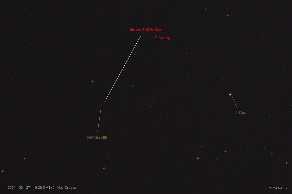 Δύσκολη η μέτρηση λόγω ώρας και θέσης στον ορίζοντα αλλά αξίζει την προσπάθεια, δεν γίνεται και κάθε μέρα έκρηξη nova. Εγώ λοιπόν μέτρησα στα 7,80 mag σε φωτομετρικό φίλτρο Jonson V, την έστειλα και στην AAVSO. Φαίνεται να σβήνει και να χάνει φωτεινότητα σιγά σιγά πλέον...