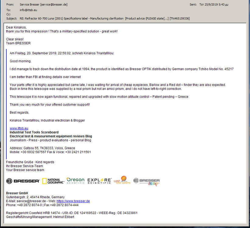 Τα νέα και οι εικόνες έφτασαν και στην BRESSER Γερμανίας, η απάντηση επαινετική και συμπιεσμένη. (Σας ευχαριστούμε για την γνωστοποίηση, πράγματι μια κατασκευή βασισμένη σε αυστηρά πρότυπα κατασκευής στρατιωτικού υλικού, μια εξαιρετική δουλειά! ) -