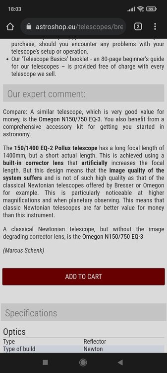 Το άλλο που αναφέρουν στη φώτο δε το ξέρω. Αλλά μου φαίνεται παρόμοιο. Ίσως έχει και εκείνο σφαιρικό κάτοπτρο. Καλύτερα SkyWatcher δοκιμασμένη ποιοτική λύση από πολλούς....