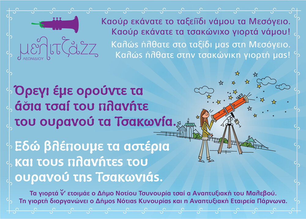 Εκ μέρους των διοργανωτών της μελιτζάzz, ευχαριστούμε θερμά την Αστρονομική Ένωση Σπάρτης για την αποδοχή της πρόσκλησης και την σημαντική παρουσία της στο φεστιβάλ και ειδικότερα τα μέλη της ΑΕΣ Παναγιώτη Κατσίχτη, Παναγιώτη Νικολακάκο και Νίκο Τρεμούλη που έκαναν τόσο κόπο παρ όλη τη κούραση και τη ζέστη! Ήταν η πρώτη φορά που στήθηκαν τηλεσκόπια για το κοινό στο Λεωνίδιο και από ότι ακούσαμε από τους ντόπιους και τους επισκέπτες εντυπωσιάστηκαν και τους άρεσε πολύ και ας ήταν κάποιοι διστακτικοί στην αρχή! Το κλου της βραδιάς ο αστερισμός της τσακώνικης μελιτζάνας, που βρέθηκε στο ουράνιο στερέωμα μόνο για το βράδυ του Σαββάτου, δημιουργία του Νίκου Τρεμούλη! Παράλληλα έγινε και καλή διαφήμιση για την πανελλήνια εξόρμηση! Ελπίζω να μας ξανάρθετε στο Λεωνίδιο και στην μελιτζάzz! Ραντεβού στα 1420 του Πάρνωνα την Παρασκευή! -