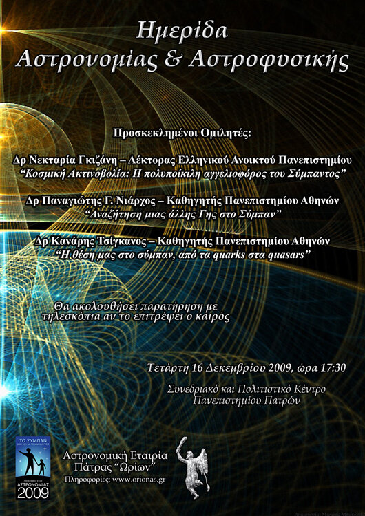 Δελτίο Τύπου Αγαπητοί φίλοι, Η Αστρονομική Εταιρεία Πάτρας «Ωρίων», ολοκληρώνει τις φετινές εκδηλώσεις για τον εορτασμό του Παγκοσμίου Έτους Αστρονομίας 2009, διοργανώνοντας Ημερίδα Αστρονομίας και Αστροφυσικής την Τετάρτη 16 Δεκεμβρίου 2009 στο Συνεδριακό Κέντρο του Πανεπιστημίου Πατρών. Σκοπός της ημερίδας είναι η ενημέρωση του μη ειδικευμένου κοινού σχετικά με την σύγχρονη έρευνα με τις νέες ανακαλύψεις της Αστρονομίας. Οι εργασίες της ημερίδας θα περιλαμβάνουν τρεις διαλέξεις από γνωστούς αστρονόμους, καθηγητές πανεπιστημίων. Παράλληλα με τις ομιλίες θα λειτουργεί και έκθεση με αστροφωτογραφίες των μελών του συλλόγου. Επιπλέον, μετά το πέρας των ομιλιών και εφόσον ο καιρός το επιτρέψει, θα πραγματοποιηθεί νυχτερινή παρατήρηση με τηλεσκόπια. Οι εργασίες του σεμιναρίου ξεκινούν στις 5:30 το απόγευμα της Τετάρτης και ολοκληρώνονται το βράδυ της ίδιας ημέρας. Το πρόγραμμα της ημερίδας έχει ως εξής: 17:30-17:45 Έναρξη-Καλωσόρισμα 17:45-18:30 «Κοσμική Ακτινοβολία: Η πολυποίκιλος αγγελιοφόρος του Σύμπαντος» Ομιλήτρια: Δρ. Νεκταρία Γκιζάνη, Λέκτορας Ανοικτού Ελληνικού Πανεπιστημίου, Μέλος Ωρίωνα 18:30-18:45 Διάλειμμα 18:45 -19:30 «Αναζητώντας μια άλλη Γη στο Σύμπαν» Ομιλητής: Δρ. Παναγιώτης Γ. Νιάρχος, Καθηγητής Πανεπιστημίου Αθηνών, Διευθυντής Τομέα Αστρονομίας Αστροφυσικής & Μηχανικής, Διευθυντής Γεροσταθοπούλειου Αστεροσκοπείου 19:30 -20:15 «Η θέση μας στο Σύμπαν, από τα Quarks στα Quasars» Ομιλητής: Δρ. Κανάρης Τσίγκανος, Καθηγητής Πανεπιστημίου Αθηνών, Πρόεδρος Ελληνικής Αστρονομικής Εταιρείας 20:30 Παρατήρηση με τηλεσκόπια Η συμμετοχή στην ημερίδα είναι δωρεάν και ελεύθερη για όλους τους φίλους της Αστρονομίας. Όσοι παρακολουθήσουν όλες τις ομιλίες της ημερίδας θα λάβουν, μετά το πέρας των εισηγήσεων, δίπλωμα συμμετοχής. Με τιμή, Το Διοικητικό Συμβούλιο του Ωρίωνα Αφίσα Ημερίδας