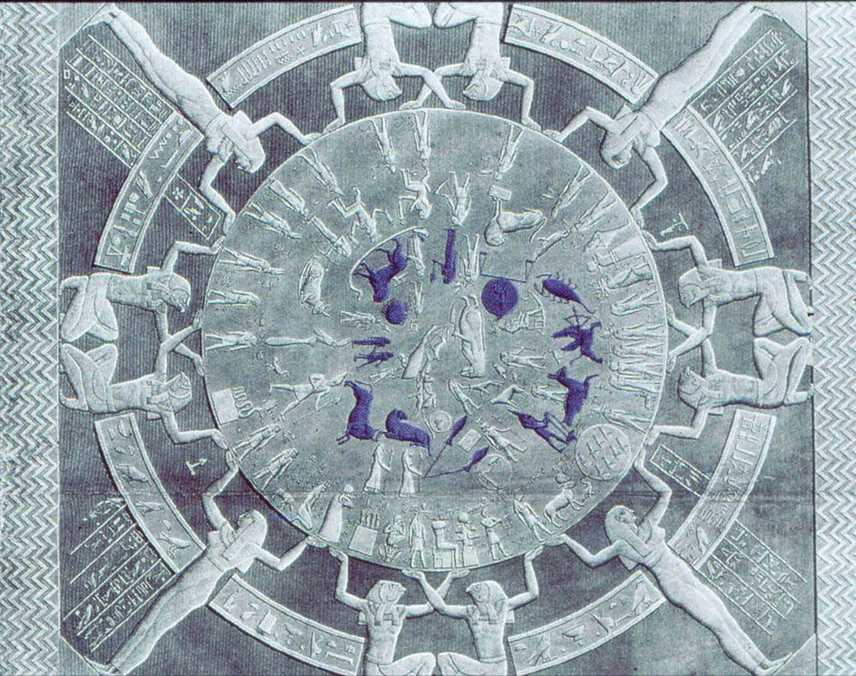 Πολλές πληροφορίες έχει και το παρακάτω βιβλίο: Ουρανογραφία η Ιστορία των Αστερισμών του Χ. Τομπουλίδη. Η τελευταία έκδοση έχει εξαντληθεί αλλά απ' ότι ξέρω θα επανεκδοθεί σύντομα. Πράγματι. Στις παρακάτω εικόνες μπορούμε να δούμε τους ζωδιακούς αστερισμούς (σημειωμένους) καθώς και πολλούς άλλους σε ένα αρχαίο Αιγυπτιακό μνημείο. Παρατηρήστε τις ομοιότητες στις μορφές και τις θέσεις κυρίως με τους μετέπειτα ελληνικούς αστερισμούς.
