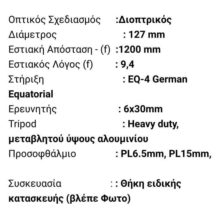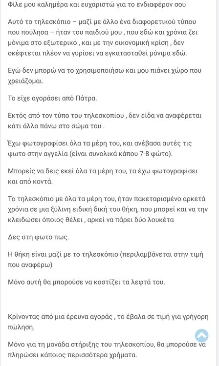 Καλησπέρα, Σκέφτομαι να αγοράσω τηλεσκόπιο, για να εξερευνήσω το διάστημα. Οι σχέσεις μου με την αστρονομία είναι σχεδόν ανύπαρκτες, αν εξαιρέσω ταινίες, σειρές και κάποια βίντεο στο youtube, δεν έχω καμία απολύτως επαφή με αυτόν τον κλάδο. Θα ήθελα όμως να αρχίσω να ασχολούμαι -ερασιτεχνικά φυσικά- ξεκινώντας με την αγορά ενός τηλεσκοπίου και γιατί όχι στο μέλλον να αναβαθμίσω τον εξοπλισμό μου για να έχω την δυνατότητα να ασχοληθώ και με την αστροφωτογραφία ( αν υπάρχει αυτή η λέξη ) διάφορων νεφελωμάτων κτλ. Έκανα μια ερώτηση τις προάλλες που αφορούσε το τι θα μπορώ να βλέπω με ένα τηλεσκόπιο των 200 ευρώ από την Αθήνα, και μου απαντήσατε πως οι δυνατότητες είναι περιορισμένες λόγω φωτορύπανσης και άλλον παραγόντων - εδώ βέβαια έχω να προσθέσω πως έχω εξωχικό στο Βραχάτι, Κόρινθο, όπου εκεί η φωτορύπανση είναι μειωμένη, οπότε πιστεύω πως μάλλον θα έχω καλύτερη ορατότητα -. Βρήκα λοιπόν ένα μεταχειρισμένο τηλεσκόπιο στην τιμή των 200 ευρώ και θα ήθελα να μου πείτε αν αξίζει ( και πόσο υπολογίζετε να κάνει καινούριο ), αν όχι θα ήθελα να μου προτείνετε ένα αξιόλογο καινούριο στην ίδια τιμή. Παρακάτω αφήνω τις φωτογραφίες από την αγγελία