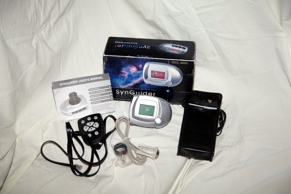 5. Πωλείται σύστημα οδήγησης SynGuider της Sky-Watcher σαν καινούργιο. Το SynGuider της SkyWatcher μπορεί να οδηγήσει μια ισημερινή στήριξη χωρίς τη βοήθεια υπολογιστή. Θα βελτιώσει την ποιότητα της εικόνας και θα σας βοηθήσει να επιτύχετε σημειακούς αστέρες στις μακράς έκθεσης φωτογραφίες σας. Διαθέτει αισθητήρα CCD, οθόνη LCD και αναβαθμίσιμο firmware. Παρακολουθεί αστέρες έως 8ου μεγέθους. Χαρακτηριστικά SynGuider 1. Αυτόνομη μονάδα – χωρίς την απαίτηση υπολογιστή 2. Αισθητήρας CCD 3. Η οθόνη LCD προβάλλει είδωλα των αστέρων σε πραγματικό χρόνο 4. Θύρα auto-guiding ST-4 5. Θύρες τηλεσκοπίου Μ42 και 1,25″ 6. Αναβαθμίσιμο firmware, μέσω internet Χαρακτηριστικά Αισθητήρα Τύπος: SONY ICX404AL CCD Μέγεθος Τσιπ: 5,59mm (X) x 4,68mm (Y) Αριθμός Λειτουργικών Pixels: 510 (Χ) x 492(Y) Μέγεθος βασικού στοιχείου: 9,6μm (X) x 7,5μm (Y) Τύπος Υπολογισμού της Διακριτικής Ικανότητας (Resolution) σε arc sec: Resolution(X) = 2261/FL Resolution(Y) = 1962/FL όπου FL: η εστιακή απόσταση του οδηγητικού τηλεσκοπίου σε mm. Τροφοδοσία DC 6V~14V, 250mA Πρίζα λήψης ρεύματος: 2,1mm, θετικό άκρο Χρόνοι Έκθεσης 1, 2, 4, 8, 16, 32, 64, 128, 256, 512, 1024, 2048, 4096 ms Ευαισθησία Τυπικά το SynGuider μπορεί να παρακολουθεί, ως οδηγούς, αστέρες μέχρι 8ου μεγέθους, υπό τις εξής προϋποθέσεις: διοπτρικό τηλεσκόπιο διαμέτρου 80mm, χρόνος έκθεσης 2048ms, καλό seeing. Περιλαμβάνει Χειριστήριο με καλώδιο και θήκη μπαταριών (Δέχεται 4 μπαταρίες τύπου D-1,5V- δεν περιλαμβάνονται) Τιμή 180€