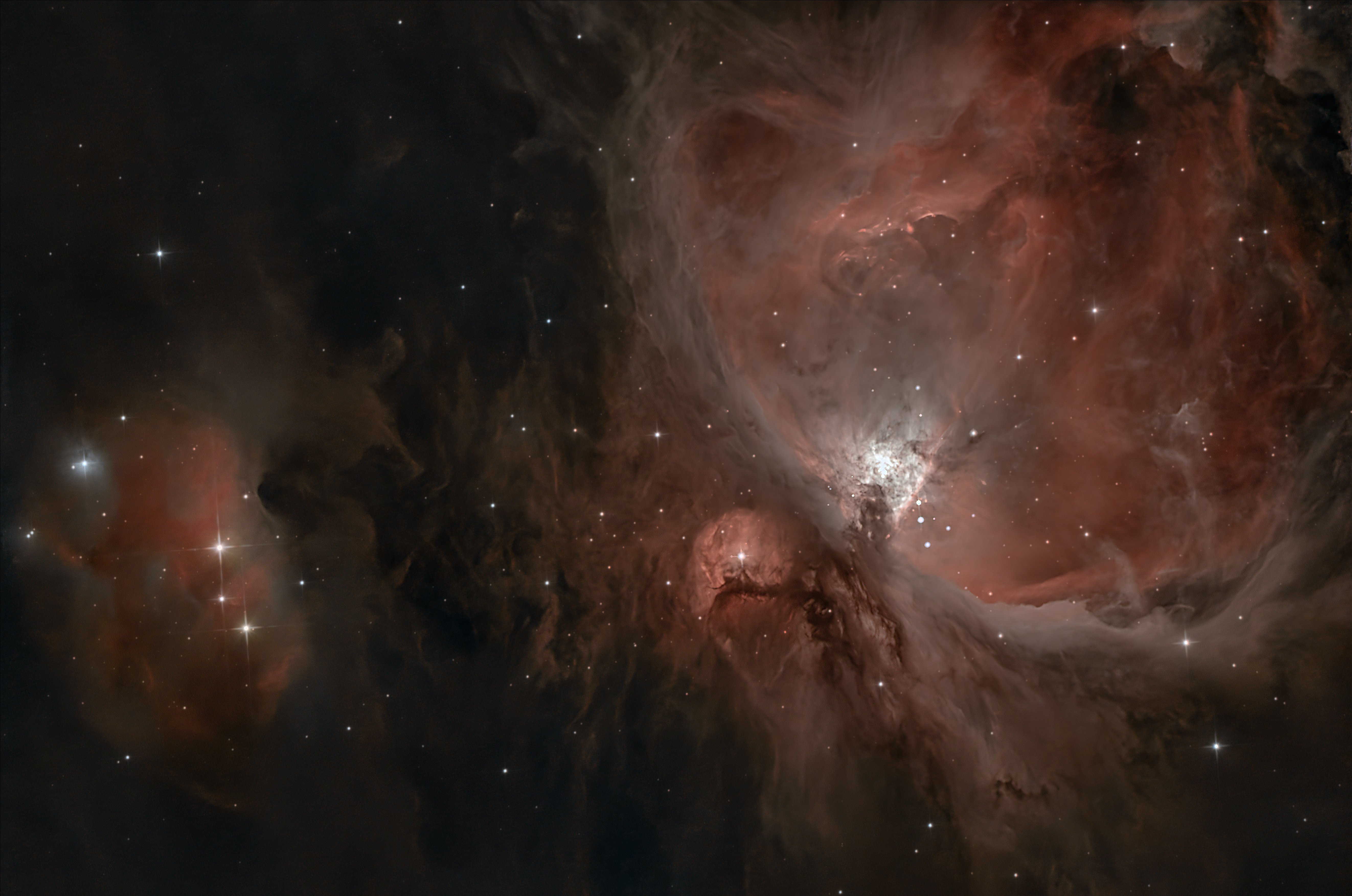 M42 ή Νεφέλωμα του Ωρίωνα (δεξιά) και NGC1977 ή Νεφέλωμα του Δρομέα (αριστερά)jslafas δημοσίευσε μία αστροφωτογραφία σε Νεφελώματα Το M42, το πιο λαμπρό νεφέλωμα στον νυχτερινό ουρανό, βρίσκεται στον αστερισμό του Ωρίωνα, περίπου 1.350 έτη φωτός μακριά από τη Γη. Είναι ένα τεράστιο νέφος αερίων και σκόνης, όπου γεννιούνται νέα άστρα. Η εκπομπή φωτός προέρχεται από την επίδραση της υπεριώδους ακτινοβολίας νεαρών και καυτών άστρων, που ιονίζει τα αέρια του νεφελώματος. Το M42 αποτελείται από διάφορες περιοχές, με την πιο διάσημη να είναι το Τραπέζιο, ένα σμήνος τεσσάρων νεαρών άστρων που φωτίζουν την καρδιά του νεφελώματος. Είναι ένα από τα πιο μελετημένα αστρονομικά αντικείμενα, καθώς προσφέρει πολύτιμες πληροφορίες για τη διαδικασία σχηματισμού άστρων. Κοντά στο M42 βρίσκεται το Νεφέλωμα του Δρομέα, μια αμυδρή, αλλά εντυπωσιακή ανακλαστική δομή. Το όνομά του προέρχεται από το σχήμα του, που μοιάζει με έναν δρομέα σε κίνηση. Το φως στο Νεφέλωμα του Δρομέα προέρχεται από την ανάκλαση του φωτός που εκπέμπουν γειτονικά άστρα πάνω στη σκόνη του νεφελώματος. -------------------------------------------- 70 x 120" (140 min) lights + calibration frames Equipment: - Mount: Skywatcher EQM35 Pro (Hyper-Tuned) - Camera: Altair Hypercam 183C Pro - Telescope: Skywatcher Explorer 130 PDS + Baader MPCC Mark III - Focuser: DIY MyFocuserPro2 - Filter: Svbony SV220 Duo-Band 2" (Ha+OIII) - Guide Camera: ZWO ASI120MM Mini - Guide Scope: SVBONY SV106 60/240mm