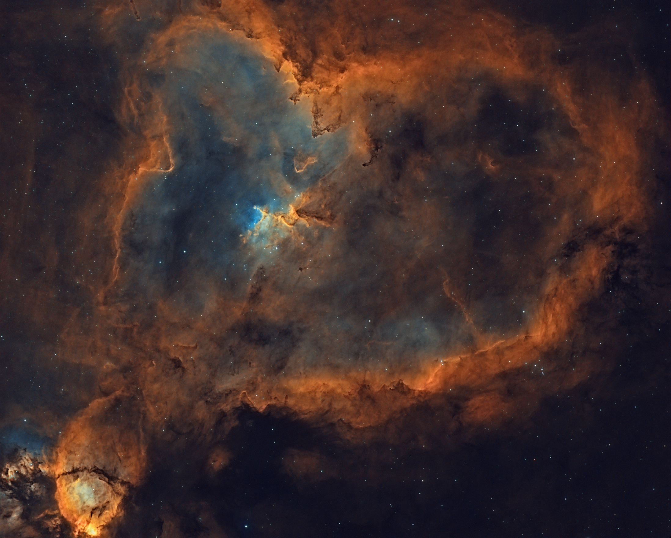 Γύρω από αυτό, σκονισμένα νέφη και ψυχρό μοριακό αέριο είναι επίσης παρόντα και δημιουργούν άλλα περίπλοκα και εκπληκτικά σχήματα.