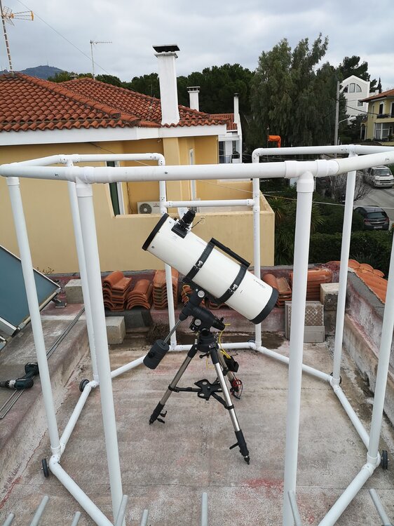 Καλησπέρα σε όλους! Μιας και πρόσφατα μπήκα στο τρύπακι της αστροφωτογραφιας. Και σύντομα κατάλαβα ότι έχω θέματα λόγω φώτων γύρω μου. Και καμιά φορά και λίγο αέρα... Είπα να πάρω την μεγάλη απόφαση και να φτιάξω κάτι όπου θα μου λύσουν κάποια θέματα. (ελπίζω να μην έχω κάνει λάθος για τις αντανακλασεις στις φωτογραφίες μου) Έτσι λοιπόν έφτιαξα αυτό που βλέπετε. Διαστάσεις: Φ2.10 Υψος 1.80 Κόστος υλικών Σωλήνες/συνδέσεις 62€ Ροδες 17€ Μουσαμας 6€ (ο οποίος έχει κοπεί και έχει ραφτει σε ένα σημείο για να έρθει στα μέτρα που θέλω. Να είναι καλά η πεθερά! Με την μηχανή της! Λύνεται και δένεται πολύ εύκολα. Και αν είστε και λάτρεις του να παίρνετε εξοπλισμό σε βουνα. Είναι κάτι όπου είναι εύκολο να πάρετε μαζί σας ίσως!