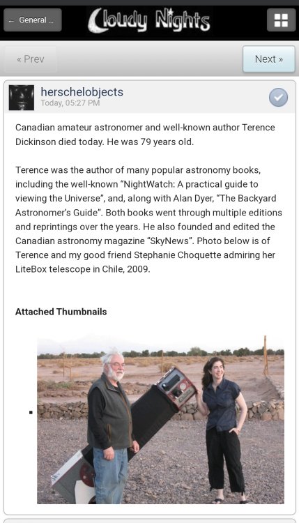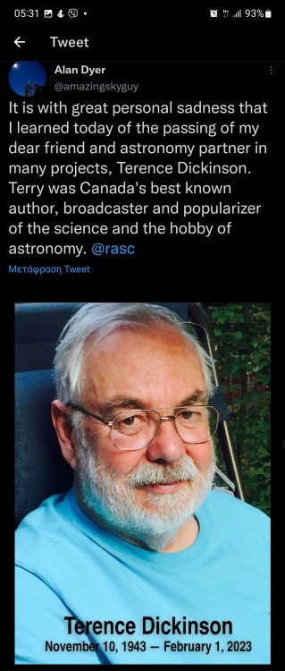 Πρωί πρωί σήμερα στο twitter είδα την παρακάτω είδηση. Ο κόσμος της ερασιτεχνική αστρονομίας έγινε ποιο φτωχός. Έφυγε ο Terence Dickinson σε ηλικία 79 ετών.