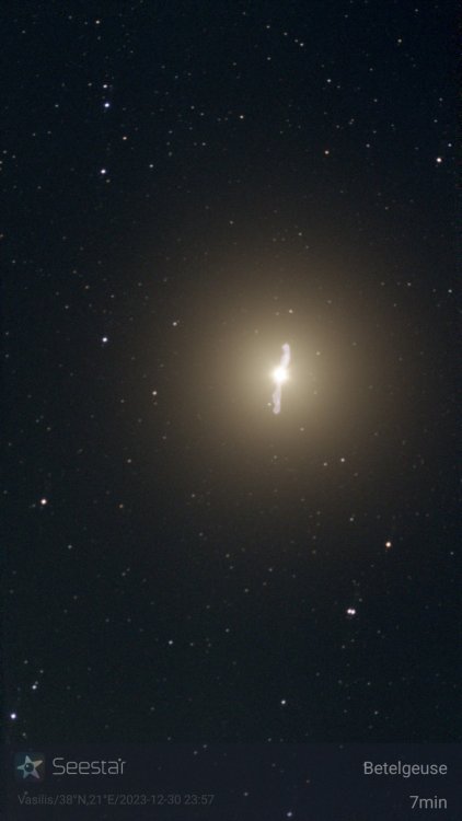 Χρόνια πολλά στην ομάδα. Εδώ και λίγες ημέρες είμαι κάτοχος του νέου smart telescope της ZWO το Seestar 50. Εχθές το βράδυ παρότι είχε σύννεφα είπα να το δοκιμάσω. Ξεκίνησα με την σελήνη πήρα κάποιες φωτογραφίες και ένα βίντεο και μετά το έστριψα στον betelgeuse. Εκεί λοιπόν πήρα δυο φωτογραφίες, η μία με έκθεση στον στόχο δύο λεπτών και η άλλη επτά λεπτά. Και η δύο είχαν το ίδιο αποτέλεσμα. Φαίνεται το αστρο να έχει κάποια δραστηριότητα. Στην ομάδα seestar στο Facebook που είμαι γραμμένος η απόψεις διίστανται. Άλλοι μου λένε ότι είναι παραμόρφωση από κούνημα, άλλοι λένε ότι μπορει κάτι να συμβαίνει. Αναρωτιέμαι αν ήταν παραμόρφωση από κούνημα, μόνο ο στόχος θα επηρεαζόταν ? Ακολουθούν οι δύο φωτογραφίες και ένα αρχείο pdf. Βασιλης (Πάτρα). 2306.00287.pdf -