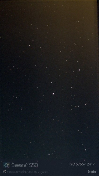 Εχθές το βράδυ χαζεύοντας τον ουρανό με το seestar, η εφαρμογή του μου έδωσε έναν στόχο τον TYC 5765-1241-1 με ένδειξη γαλαξία. Πάτησα το goto και 6 λεπτά αργότερα πήρα την παρακάτω φωτογραφία. Από εκείνη την ώρα η ένδειξη χάθηκε από τον χάρτη. Έψαξα στην εφαρμογή του τηλεσκοπίου δεν βρήκα τίποτα. Έψαξα στο Google πάλι δεν βρήκα τίποτα. Μπήκα στο ιστολόγιο της ΝΑΣΑ και εκεί δεν βρήκα τίποτα. Τι ουράνιο σώμα μπορεί να είναι ο TYC 5765-1241-1.