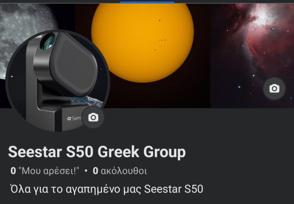Χαιρετίζω την ομάδα. Έφτιαξα μια ομάδα στο Facebook για το αγαπημένο μας seestar S50. Να μοιραζόμαστε φωτογραφίες και ιδέες. Σας περιμένω όλους. Βασίλης Κον. https://www.facebook.com/share/19UVveSfL1/?mibextid=qi2Omg